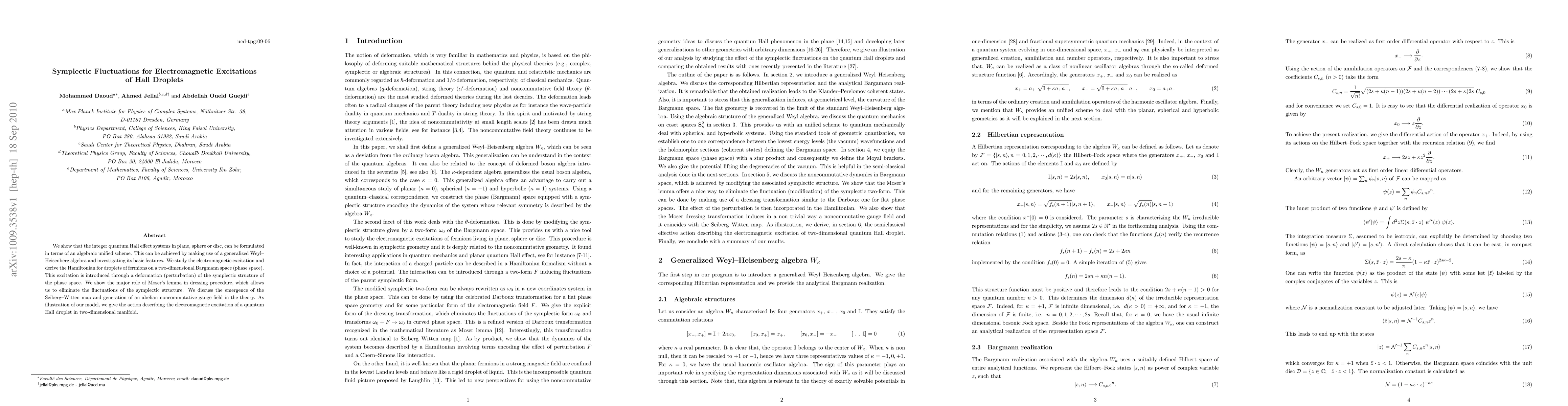 We show that the integer quantum Hall effect systems in plane, sphere or disc, can be formulated in terms of an algebraic unified scheme. This can be achieved by making use of a generalized Weyl--Heisenberg algebra and investigating its basic features. We study the electromagnetic excitation and derive the Hamiltonian for droplets of fermions on a two-dimensional Bargmann space (phase space). This excitation is introduced through a deformation (perturbation) of the symplectic structure of the phase space. We show the major role of Moser's lemma in dressing procedure, which allows us to eliminate the fluctuations of the symplectic structure. We discuss the emergence of the Seiberg--Witten map and generation of an abelian noncommutative gauge field in the theory. As illustration of our model, we give the action describing the electromagnetic excitation of a quantum Hall droplet in two-dimensional manifold.