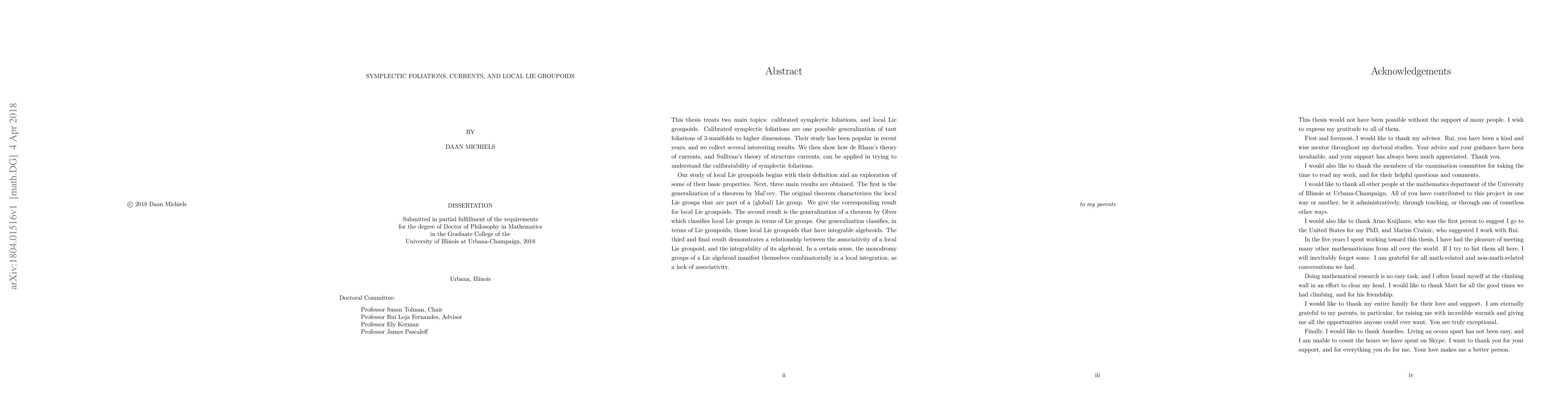 This thesis treats two main topics: calibrated symplectic foliations, and local Lie groupoids. Calibrated symplectic foliations are one possible generalization of taut foliations of 3-manifolds to higher dimensions. Their study has been popular in recent years, and we collect several interesting results. We then show how de Rham's theory of currents, and Sullivan's theory of structure currents, can be applied in trying to understand the calibratability of symplectic foliations. Our study of local Lie groupoids begins with their definition and an exploration of some of their basic properties. Next, three main results are obtained. The first is the generalization of a theorem by Mal'cev. The original theorem characterizes the local Lie groups that are part of a (global) Lie group. We give the corresponding result for local Lie groupoids. The second result is the generalization of a theorem by Olver which classifies local Lie groups in terms of Lie groups. Our generalization classifies, in terms of Lie groupoids, those local Lie groupoids that have integrable algebroids. The third and final result demonstrates a relationship between the associativity of a local Lie groupoid, and the integrability of its algebroid. In a certain sense, the monodromy groups of a Lie algebroid manifest themselves combinatorially in a local integration, as a lack of associativity.