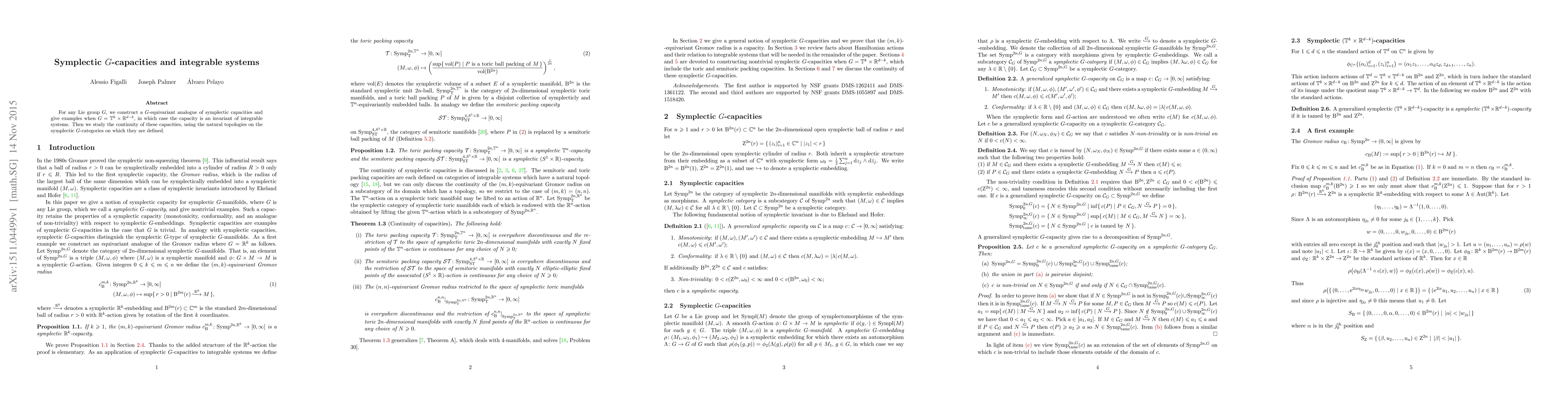 This paper constructs $G$-equivariant analogues of symplectic capacities for any Lie group $G$, providing examples for $G = \mathbb{T}^k\times\mathbb{R}^{d-k}$ and demonstrating their role as invariants for integrable systems. It also investigates the continuity of these capacities within the relevant symplectic $G$-categories.