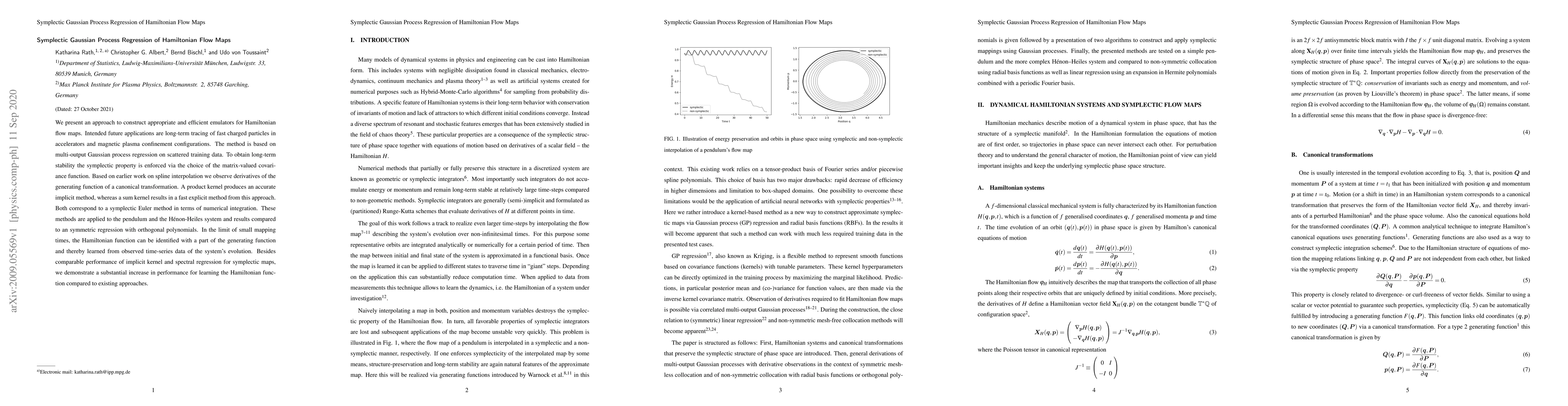 We present an approach to construct appropriate and efficient emulators for Hamiltonian flow maps. Intended future applications are long-term tracing of fast charged particles in accelerators and magnetic plasma confinement configurations. The method is based on multi-output Gaussian process regression on scattered training data. To obtain long-term stability the symplectic property is enforced via the choice of the matrix-valued covariance function. Based on earlier work on spline interpolation we observe derivatives of the generating function of a canonical transformation. A product kernel produces an accurate implicit method, whereas a sum kernel results in a fast explicit method from this approach. Both correspond to a symplectic Euler method in terms of numerical integration. These methods are applied to the pendulum and the H\'enon-Heiles system and results compared to an symmetric regression with orthogonal polynomials. In the limit of small mapping times, the Hamiltonian function can be identified with a part of the generating function and thereby learned from observed time-series data of the system's evolution. Besides comparable performance of implicit kernel and spectral regression for symplectic maps, we demonstrate a substantial increase in performance for learning the Hamiltonian function compared to existing approaches.