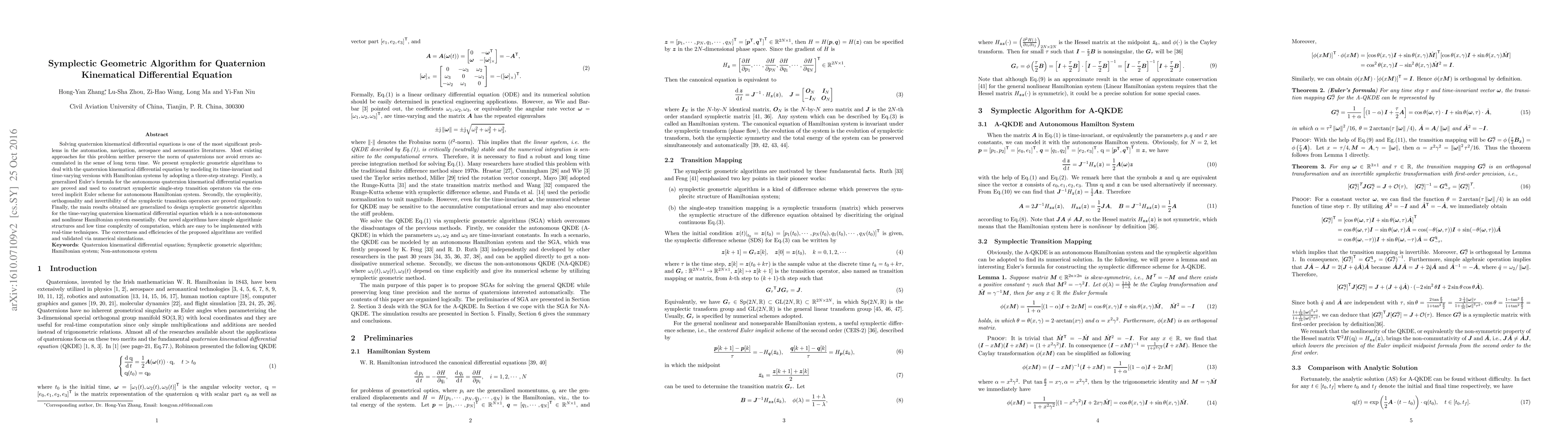 Researchers propose a symplectic geometric algorithm to solve quaternion kinematical differential equations with time-invariant and time-varying versions, ensuring norm preservation and low computational complexity.