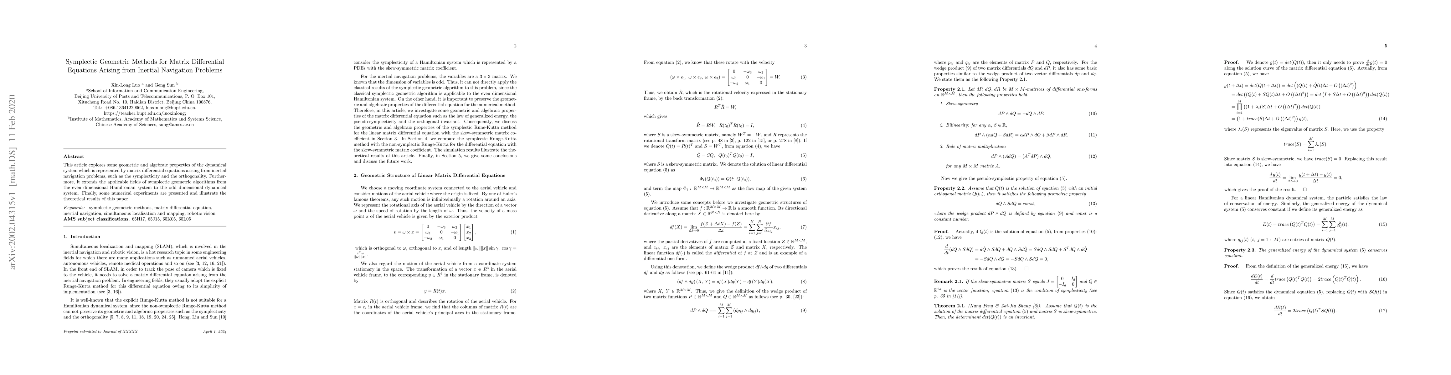 This article explores some geometric and algebraic properties of the dynamical system which is represented by matrix differential equations arising from inertial navigation problems, such as the symplecticity and the orthogonality. Furthermore, it extends the applicable fields of symplectic geometric algorithms from the even dimensional Hamiltonian system to the odd dimensional dynamical system. Finally, some numerical experiments are presented and illustrate the theoretical results of this paper.