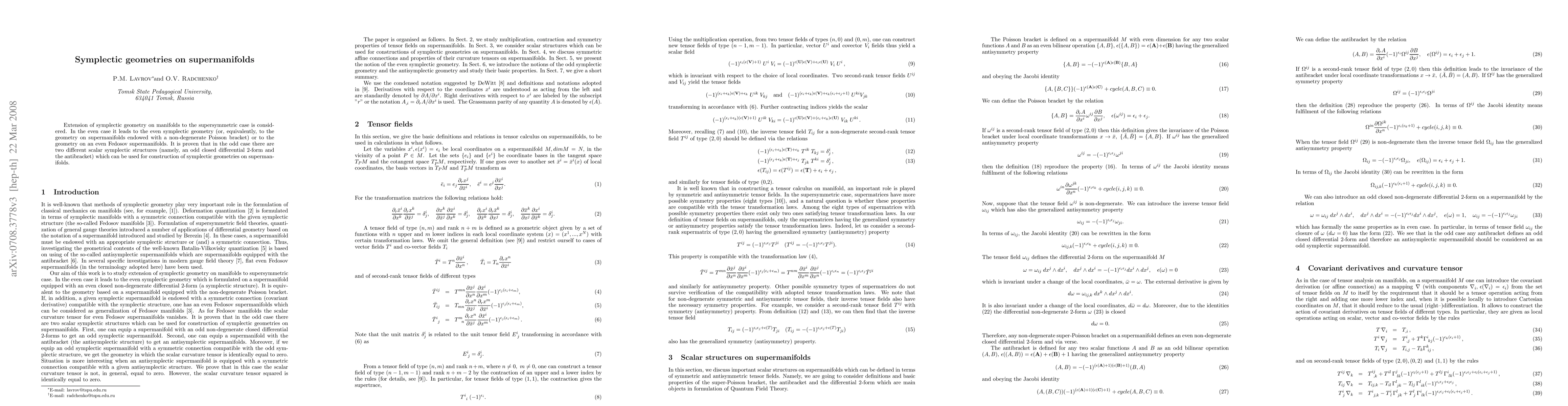 This paper extends classical symplectic geometry to supermanifolds, distinguishing between even and odd cases. In the even case, it results in even symplectic geometry or geometry on Fedosov supermanifolds, while the odd case presents two distinct scalar symplectic structures: an odd closed differential 2-form and the antibracket.
