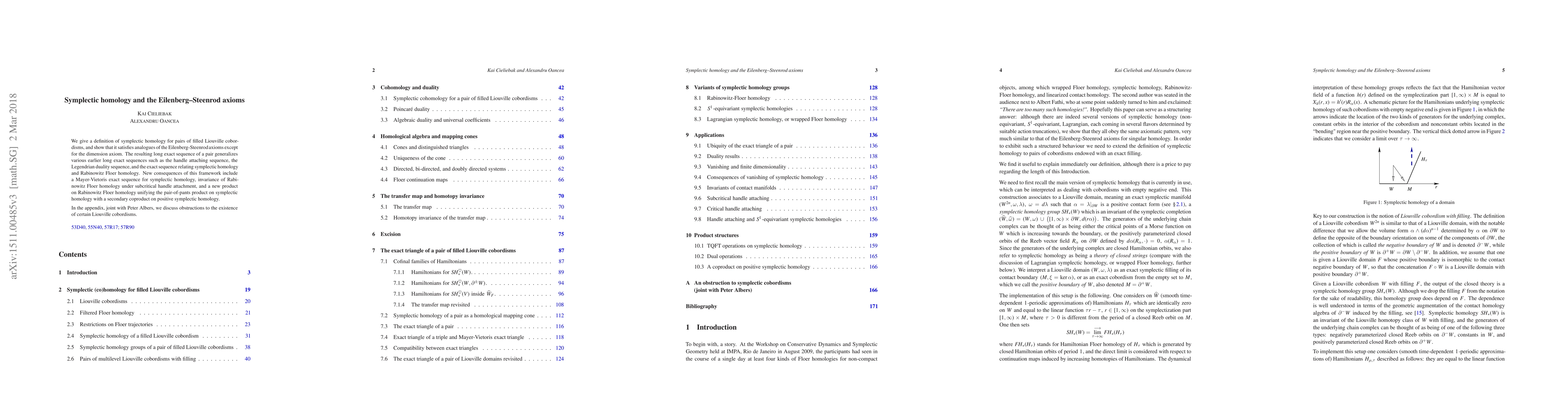 We give a definition of symplectic homology for pairs of filled Liouville cobordisms, and show that it satisfies analogues of the Eilenberg-Steenrod axioms except for the dimension axiom. The resulting long exact sequence of a pair generalizes various earlier long exact sequences such as the handle attaching sequence, the Legendrian duality sequence, and the exact sequence relating symplectic homology and Rabinowitz Floer homology. New consequences of this framework include a Mayer-Vietoris exact sequence for symplectic homology, invariance of Rabinowitz Floer homology under subcritical handle attachment, and a new product on Rabinowitz Floer homology unifying the pair-of-pants product on symplectic homology with a secondary coproduct on positive symplectic homology. In the appendix, joint with Peter Albers, we discuss obstructions to the existence of certain Liouville cobordisms.