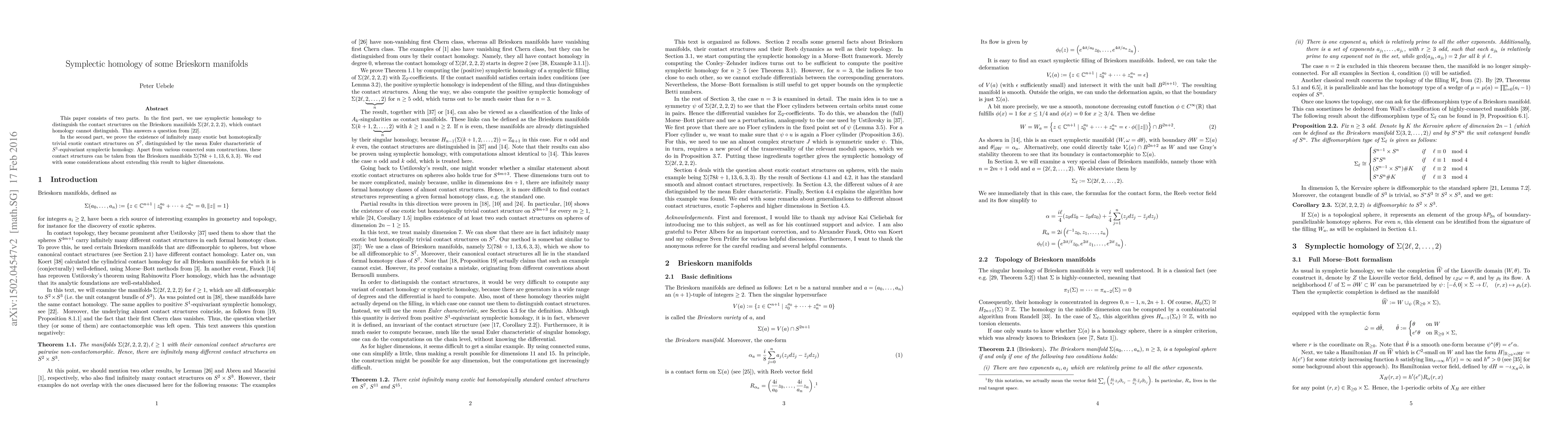 This paper consists of two parts. In the first part, we use symplectic homology to distinguish the contact structures on the Brieskorn manifolds $\Sigma(2l,2,2,2)$, which contact homology cannot distinguish. This answers a question from [22]. In the second part, we prove the existence of infinitely many exotic but homotopically trivial exotic contact structures on $S^7$, distinguished by the mean Euler characteristic of $S^1$-equivariant symplectic homology. Apart from various connected sum constructions, these contact structures can be taken from the Brieskorn manifolds $\Sigma(78k+1,13,6,3,3)$. We end with some considerations about extending this result to higher dimensions.