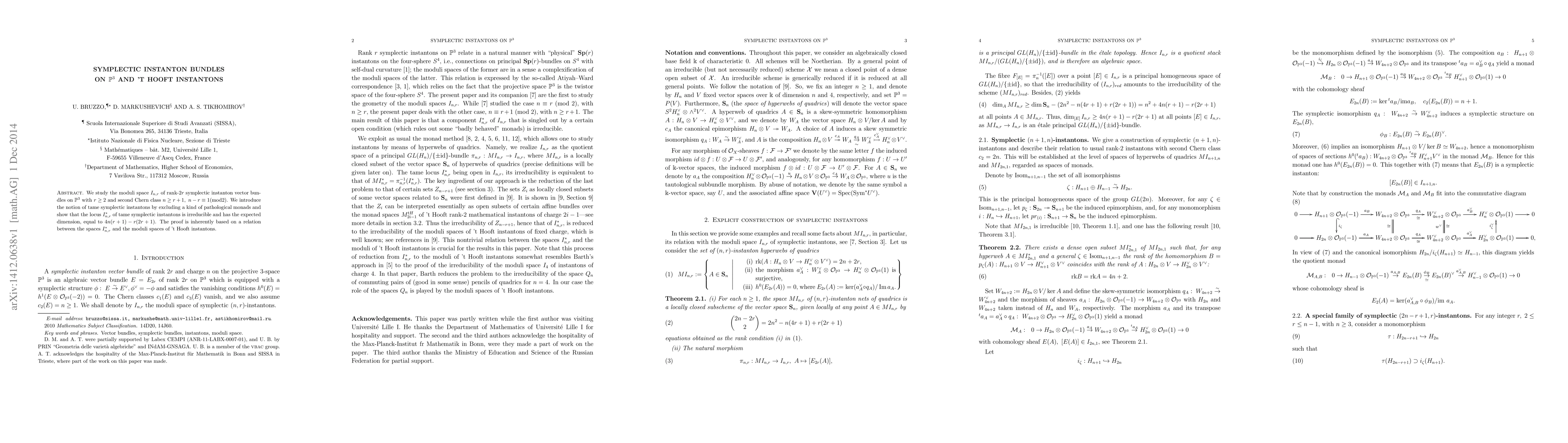 This paper investigates the moduli space of rank-$2r$ symplectic instanton vector bundles on projective 3-space and establishes the irreducibility and expected dimension of tame symplectic instantons. It demonstrates a connection between these instantons and the moduli spaces of 't Hooft instantons.