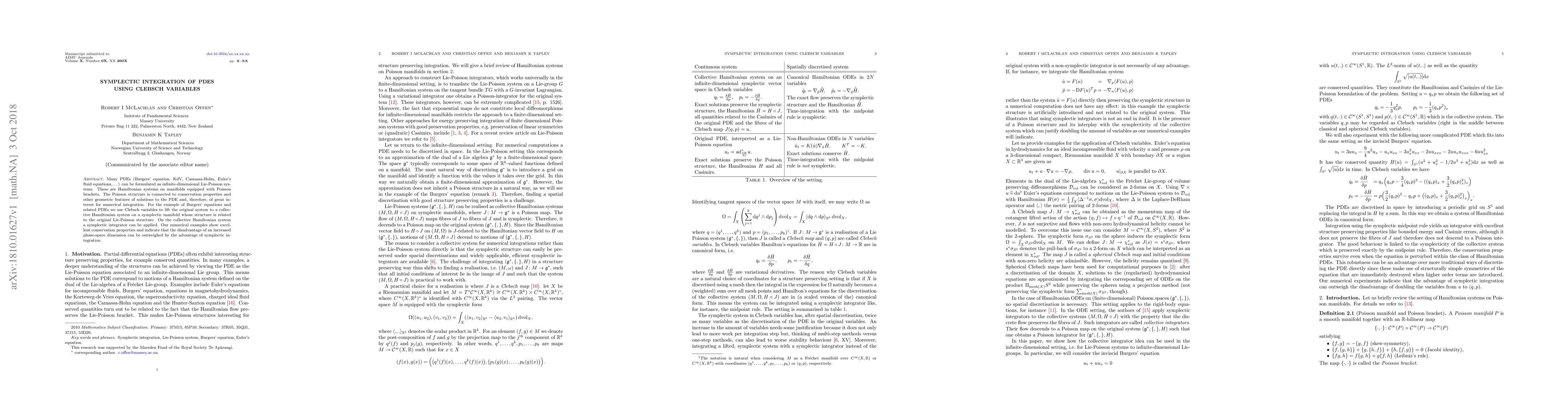 This paper proposes using Clebsch variables to reformulate PDEs like Burgers' and Euler's fluid equations as Hamiltonian systems on symplectic manifolds. It demonstrates that symplectic integration of these systems preserves geometric properties and outperforms traditional methods despite the higher phase-space dimension.