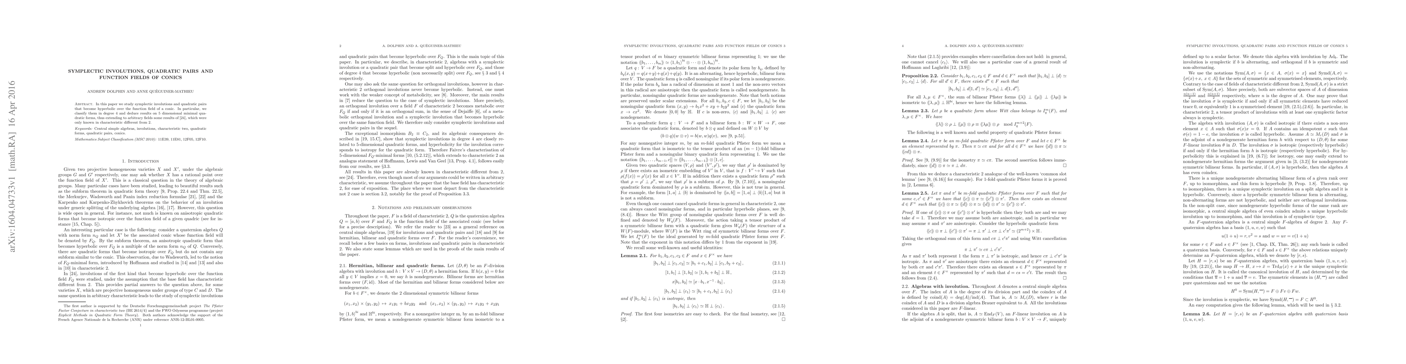 This paper classifies symplectic involutions and quadratic pairs that become hyperbolic over the function field of a conic, focusing on degree 4 cases. It extends results on 5-dimensional minimal quadratic forms to arbitrary fields, generalizing findings previously limited to characteristics different from 2.