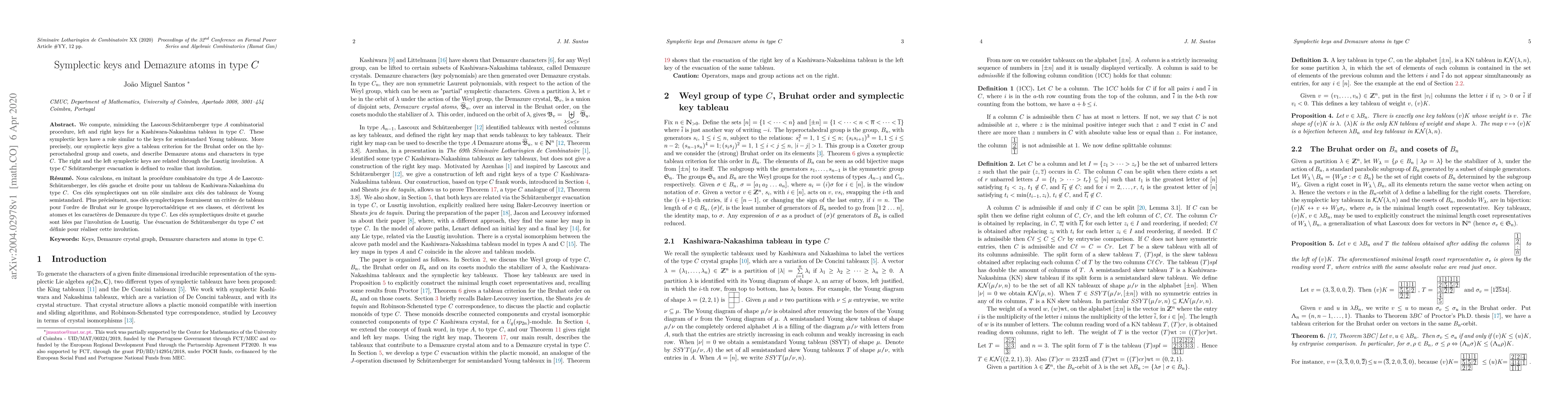 We compute, mimicking the Lascoux-Sch\"utzenberger type A combinatorial procedure, left and right keys for a Kashiwara-Nakashima tableau in type C. These symplectic keys have a similar role as the keys for semistandard Young tableaux. More precisely, our symplectic keys give a tableau criterion for the Bruhat order on the hyperoctahedral group and cosets, and describe Demazure atoms and characters in type C. The right and the left symplectic keys are related through the Lusztig involution. A type C Sch\"utzenberger evacuation is defined to realize that involution.