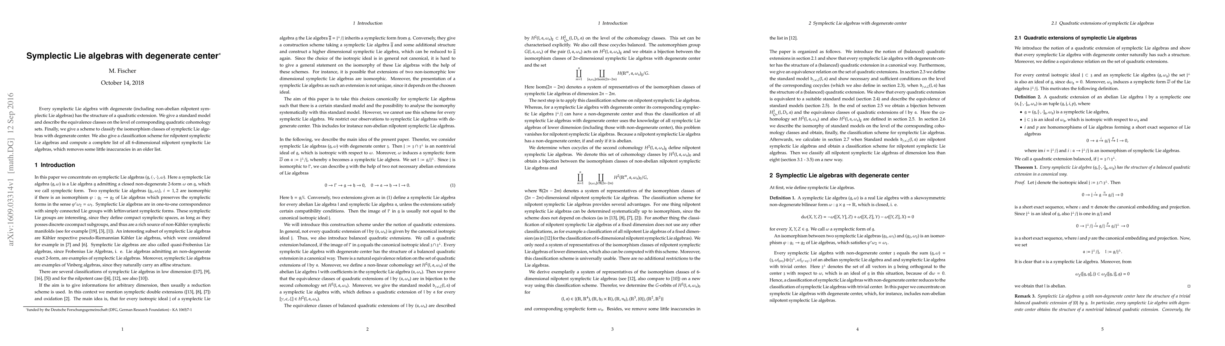 This paper establishes a quadratic extension structure for symplectic Lie algebras with degenerate centers, provides a standard model and classification scheme for these algebras, and rectifies inaccuracies in the older classification of 6-dimensional nilpotent symplectic Lie algebras.