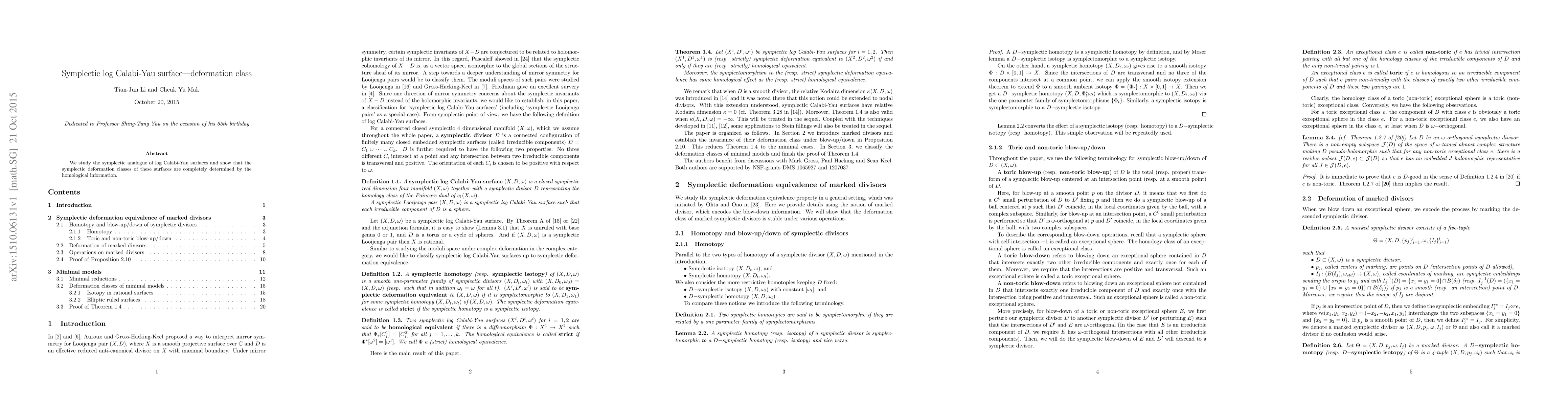 The paper investigates the symplectic version of log Calabi-Yau surfaces, demonstrating that their deformation classes are entirely governed by homological data. The study reveals the complete determination of symplectic deformation classes based on homological information.