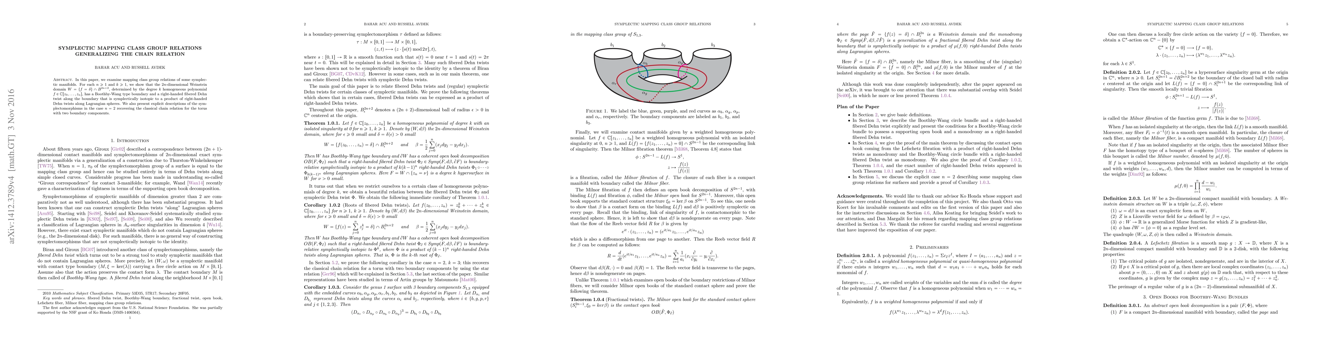 In this paper, we examine mapping class group relations of some symplectic manifolds. For each $n\geq 1$ and $k \geq 1$, we show that the $2n$-dimensional Weinstein domain $W = \{f=\delta\} \cap B^{2n+2}$, determined by the degree $k$ homogeneous polynomial $f\in \mathbb{C}[z_0,\dots,z_n]$, has a Boothby-Wang type boundary and a right-handed fibered Dehn twist along the boundary that is symplectically isotopic to a product of right-handed Dehn twists along Lagrangian spheres. We also present explicit descriptions of the symplectomorphisms in the case $n=2$ recovering the classical chain relation for the torus with two boundary components.