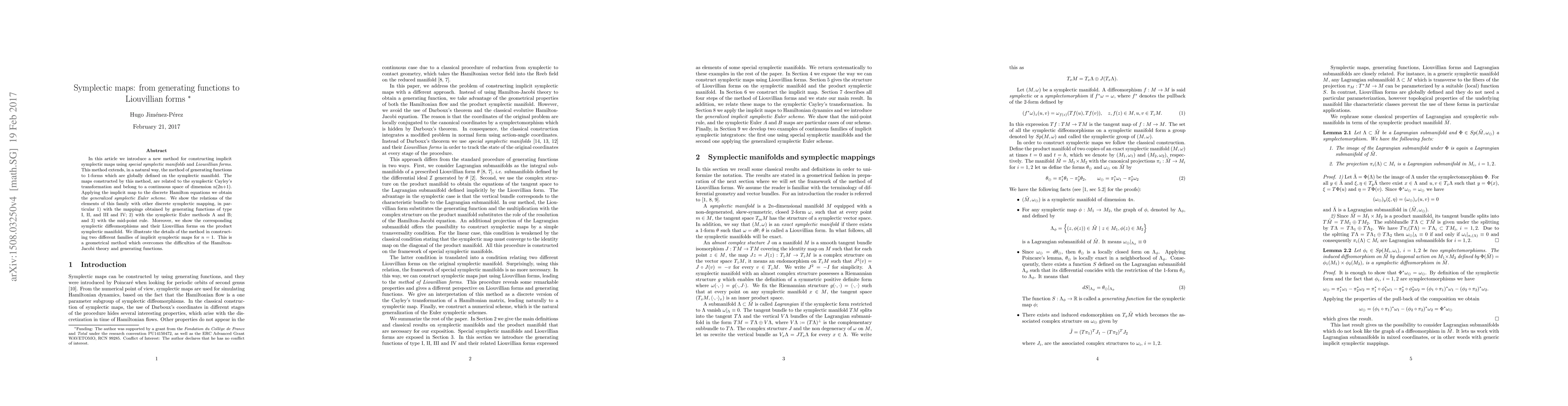 In this article we introduce a new method for constructing implicit symplectic maps using special symplectic manifolds and Liouvillian forms. This method extends, in a natural way, the method of generating functions to 1-forms which are globally defined on the symplectic manifold. The maps constructed by this method, are related to the symplectic Cayley's transformation and belong to a continuous space of dimension n(2n+1). Applying the implicit map to the discrete Hamilton equations we obtain the generalized symplectic Euler scheme. We show the relations of the elements of this family with other discrete symplectic mapping, in particular 1) with the mappings obtained by generating functions of type I, II, and III and IV; 2) with the symplectic Euler methods A and B; and 3) with the mid-point rule. Moreover, we show the corresponding symplectic diffeomorphisms and their Liouvillian forms on the product symplectic manifold. We illustrate the details of the method in constructing two different families of implicit symplectic maps for $n=1$. This is a geometrical method which overcomes the difficulties of the Hamilton-Jacobi theory and generating functions.