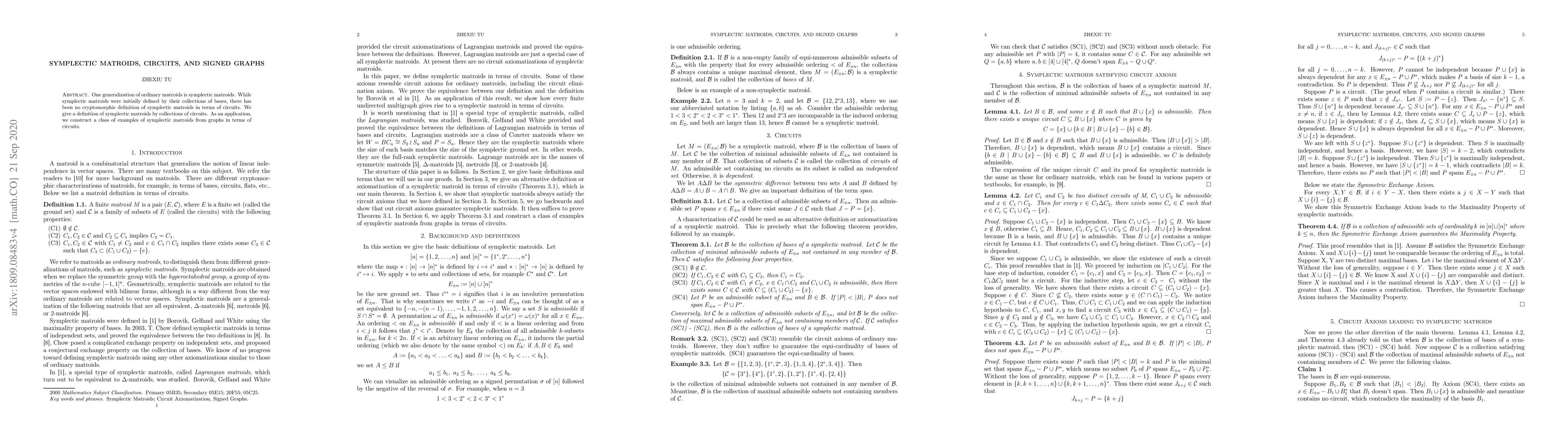 This paper presents a cryptomorphic definition of symplectic matroids using circuits, rather than bases, and demonstrates this with examples derived from signed graphs.
