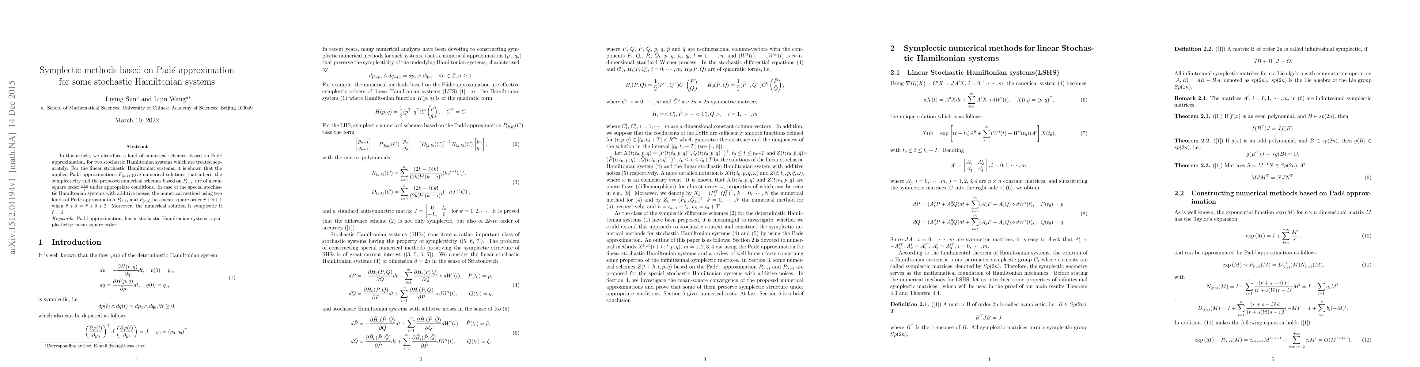 This paper proposes numerical schemes based on Padé approximation for solving two stochastic Hamiltonian systems. For linear systems, the schemes maintain symplecticity and achieve mean-square order $\frac{r+s}{2}$. For special systems with additive noise, the method attains mean-square order $\check r+\check s+1$ under specific conditions and remains symplectic if $\hat r=\hat s$.