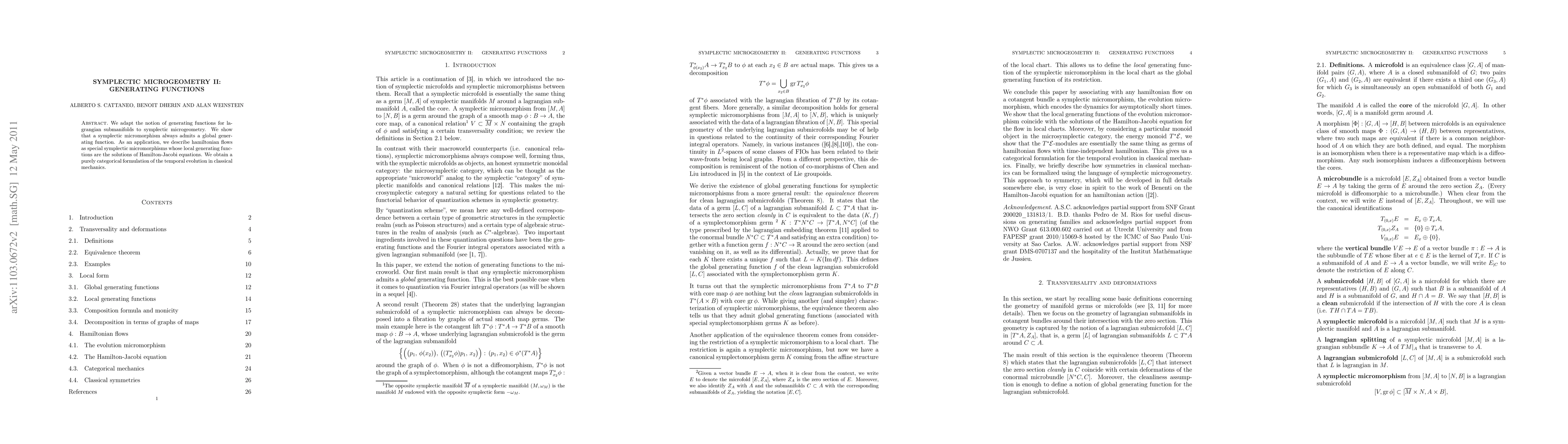 This paper extends the concept of generating functions to symplectic microgeometry, proving that every symplectic micromorphism has a global generating function. It applies this to describe Hamiltonian flows as special micromorphisms, leading to a purely categorical framework for classical mechanics' temporal evolution.