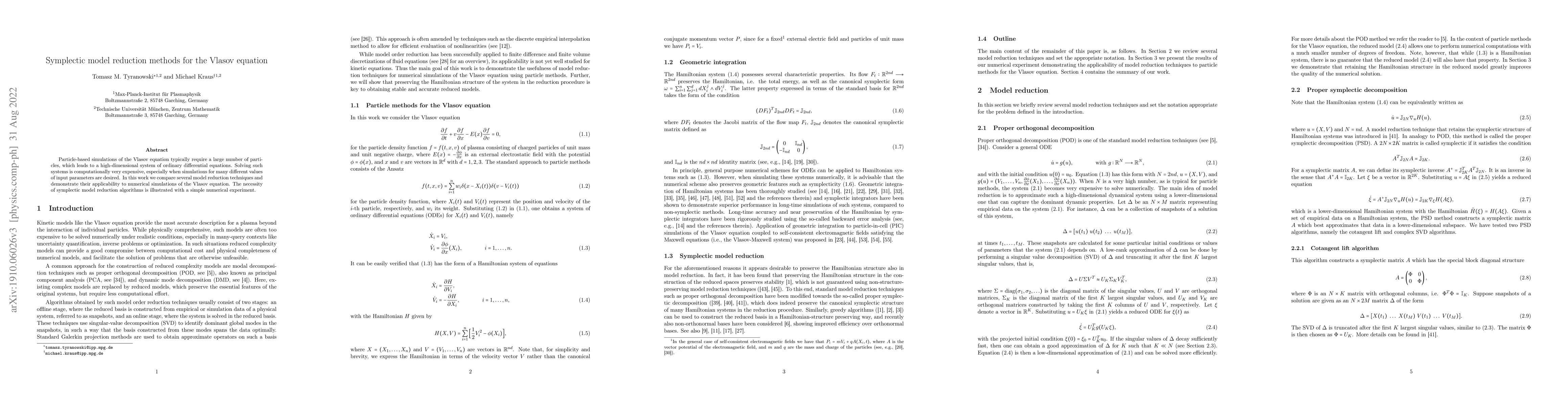 This paper explores model reduction techniques for the Vlasov equation, which is computationally intensive due to its high-dimensional nature. The study compares various symplectic methods and demonstrates their effectiveness through a numerical experiment, highlighting the importance of these algorithms for efficient simulations.