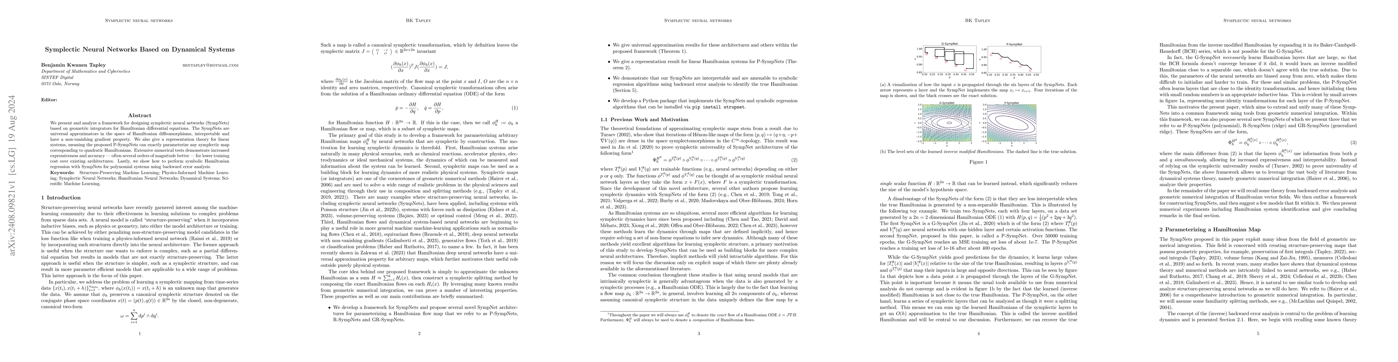 We present and analyze a framework for designing symplectic neural networks (SympNets) based on geometric integrators for Hamiltonian differential equations. The SympNets are universal approximators in the space of Hamiltonian diffeomorphisms, interpretable and have a non-vanishing gradient property. We also give a representation theory for linear systems, meaning the proposed P-SympNets can exactly parameterize any symplectic map corresponding to quadratic Hamiltonians. Extensive numerical tests demonstrate increased expressiveness and accuracy -- often several orders of magnitude better -- for lower training cost over existing architectures. Lastly, we show how to perform symbolic Hamiltonian regression with SympNets for polynomial systems using backward error analysis.