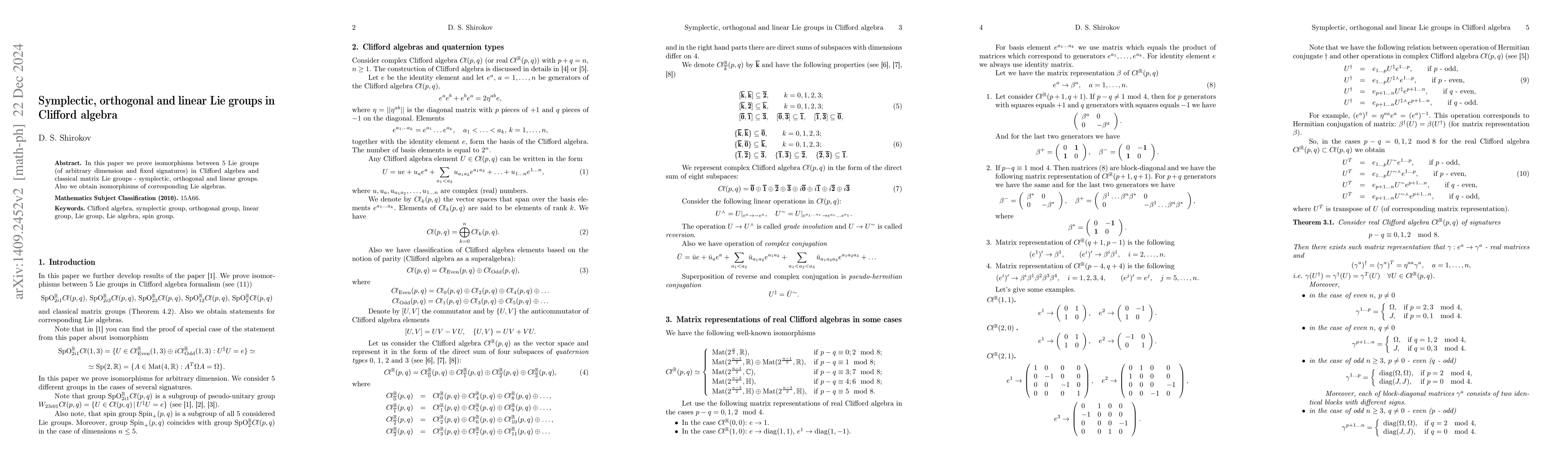 In this paper we prove isomorphisms between 5 Lie groups (of arbitrary dimension and fixed signatures) in Clifford algebra and classical matrix Lie groups - symplectic, orthogonal and linear groups. Also we obtain isomorphisms of corresponding Lie algebras.