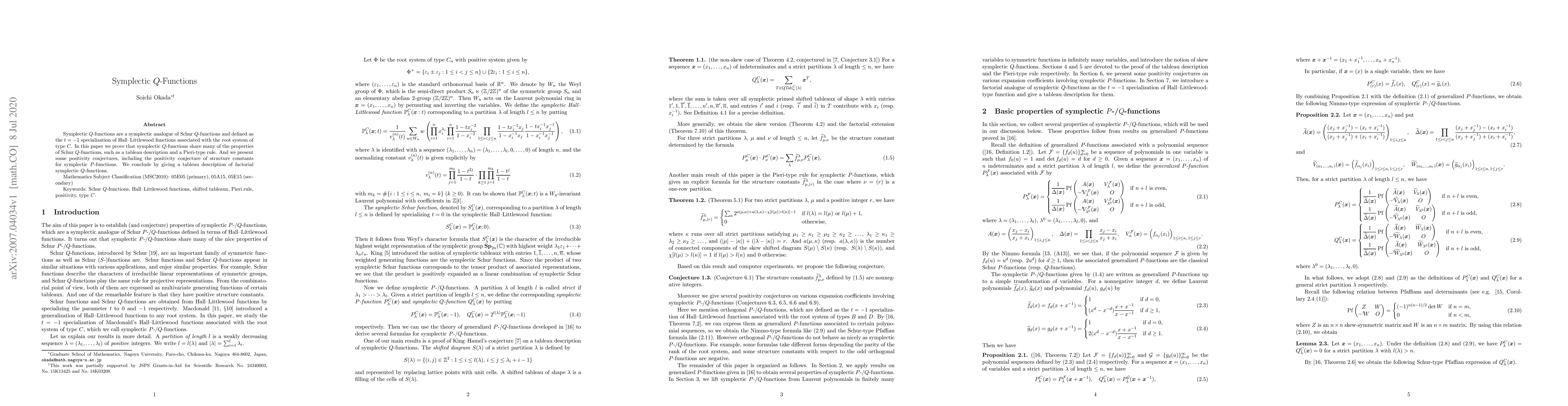 This paper introduces symplectic $Q$-functions, a symplectic analogue of Schur $Q$-functions, and demonstrates their properties, including a tableau description and a Pieri-type rule. The authors also propose conjectures on the positivity of structure constants for symplectic $P$-functions.