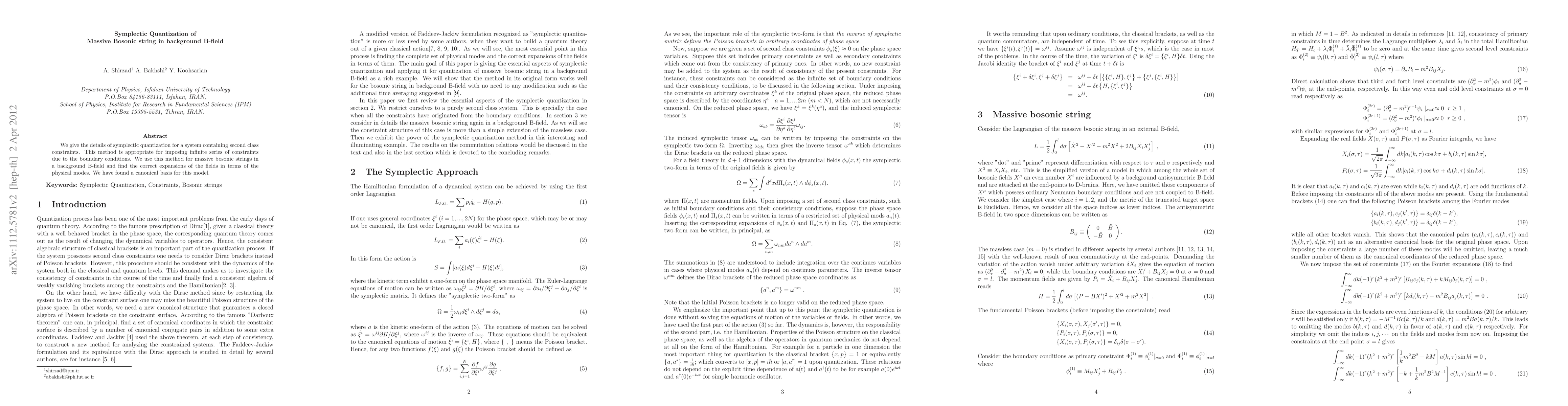 Symplectic quantization is applied to massive bosonic strings in a background B-field, successfully imposing constraints due to boundary conditions and identifying a canonical basis for the model. The method yields correct expansions of fields in terms of physical modes.