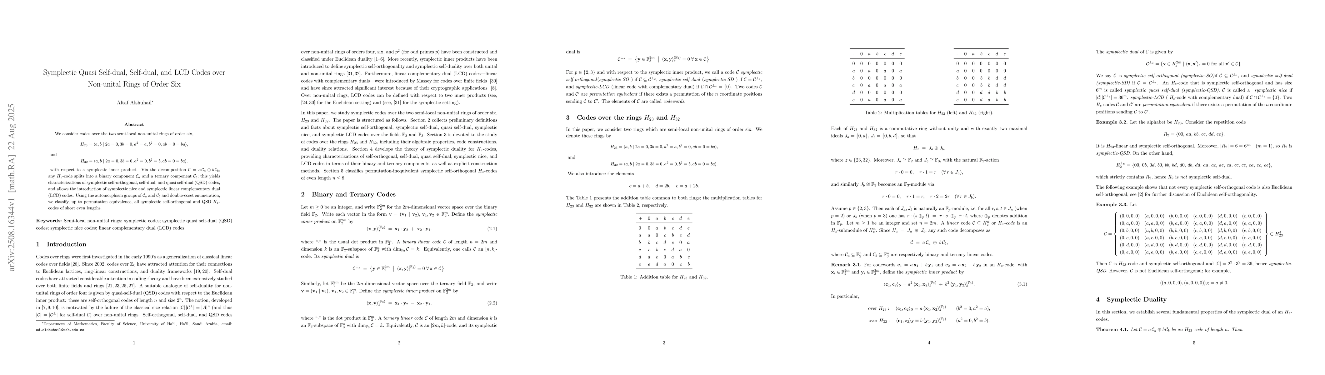 We consider codes over the two semi-local non-unital rings of order six, \[ H_{23} = \langle a,b \mid 2a=0, 3b = 0, a^2=a, b^2 = 0, ab = 0 = ba \rangle,\] and \[H_{32} = \langle a,b \mid 2a=0, 3b = 0, a^2=0, b^2 = b, ab = 0 = ba \rangle. \] with respect to a symplectic inner product. Via the decomposition $\mathcal{C} = a\,\mathcal{C}_a\oplus b\,\mathcal{C}_b$, any $H_z$-code splits into a binary component $\mathcal{C}_a$ and a ternary component $\mathcal{C}_b$; this yields characterizations of symplectic self-orthogonal, self-dual, and quasi self-dual (QSD) codes, and allows the introduction of symplectic nice and symplectic linear complementary dual (LCD) codes. Using the automorphism groups of $\mathcal{C}_a$ and $\mathcal{C}_b$ and double-coset enumeration, we classify, up to permutation equivalence, all symplectic self-orthogonal and QSD $H_z$-codes of short even lengths.