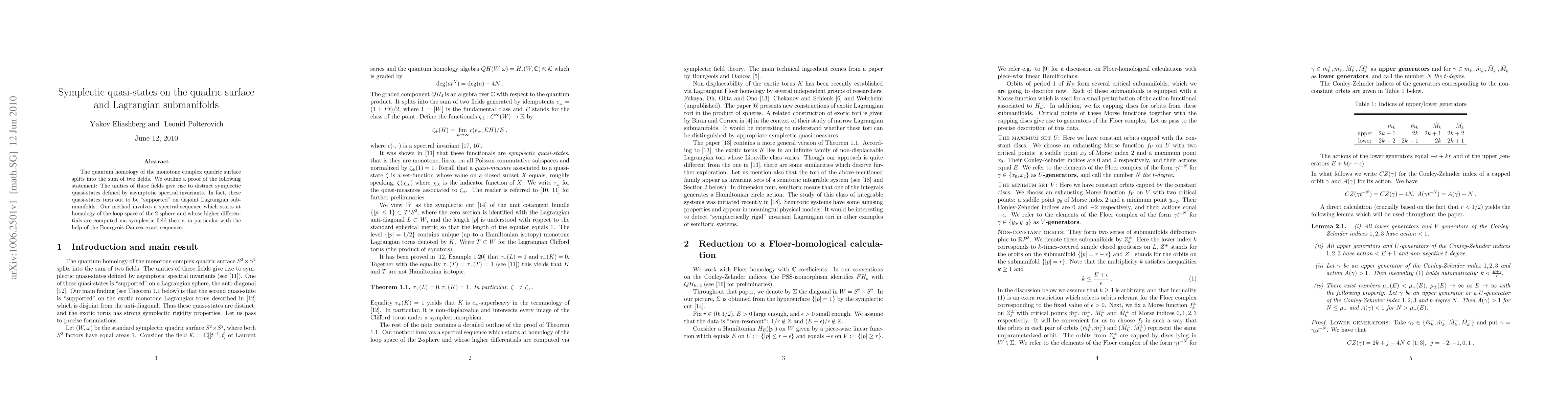Summary: The research demonstrates that the quantum homology of a monotone complex quadric surface can be split into two distinct fields, each associated with unique symplectic quasi-states supported on disjoint Lagrangian submanifolds, using a spectral sequence approach informed by symplectic field theory.