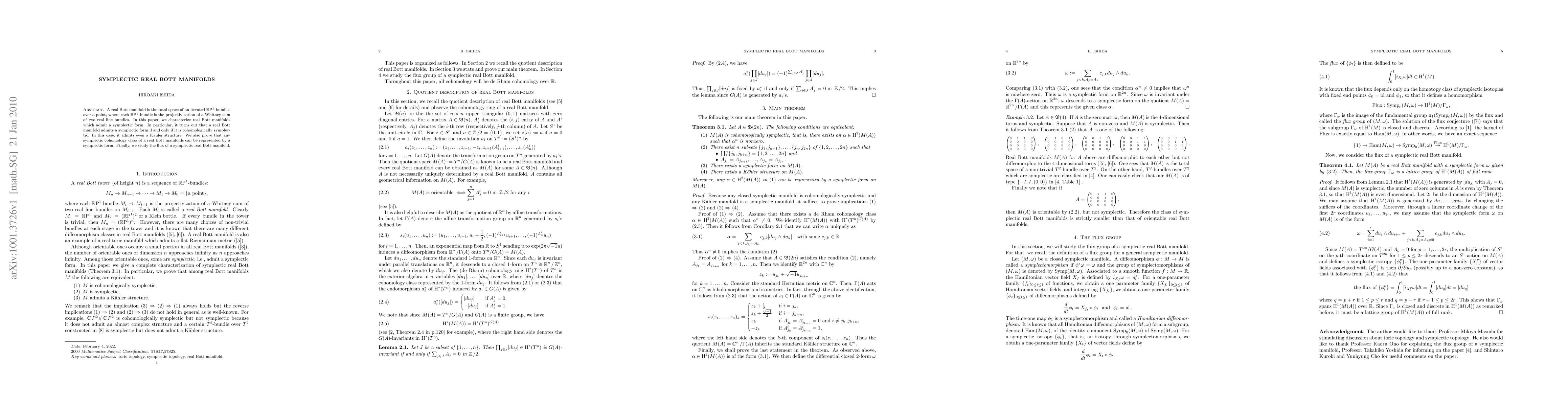 This paper characterizes real Bott manifolds that admit symplectic forms, showing they are cohomologically symplectic and can also support Kähler structures. It concludes by proving that any symplectic cohomology class can be represented by a symplectic form and explores the flux of these manifolds.