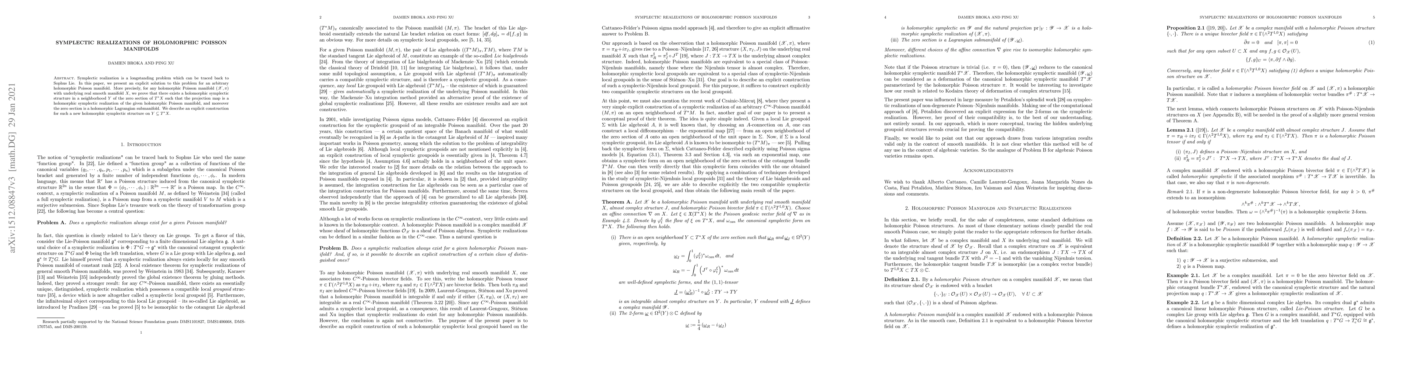 This paper presents an explicit solution to the longstanding problem of symplectic realization for any holomorphic Poisson manifold $(X, \pi)$. It proves the existence of a holomorphic symplectic structure on a neighborhood $Y$ of the zero section in $T^*X$, where the projection map serves as a symplectic realization, and the zero section is a holomorphic Lagrangian submanifold.