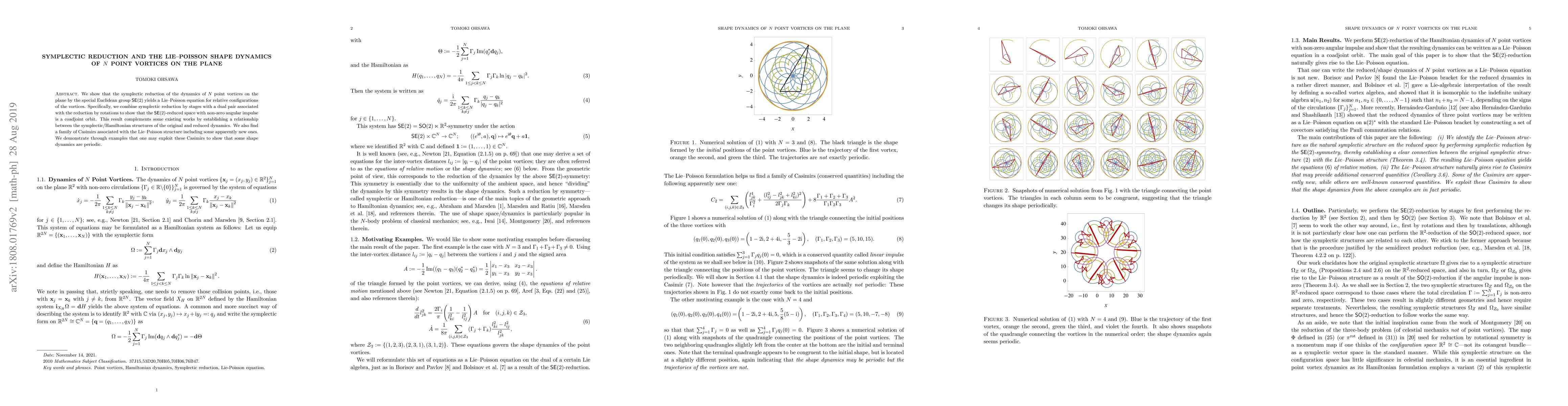 This paper demonstrates the symplectic reduction of $N$ point vortices' dynamics on the plane by $\mathsf{SE}(2)$, leading to a Lie-Poisson equation for relative vortex configurations. It identifies a coadjoint orbit in the reduced space and discovers new Casimirs that can show periodic shape dynamics.