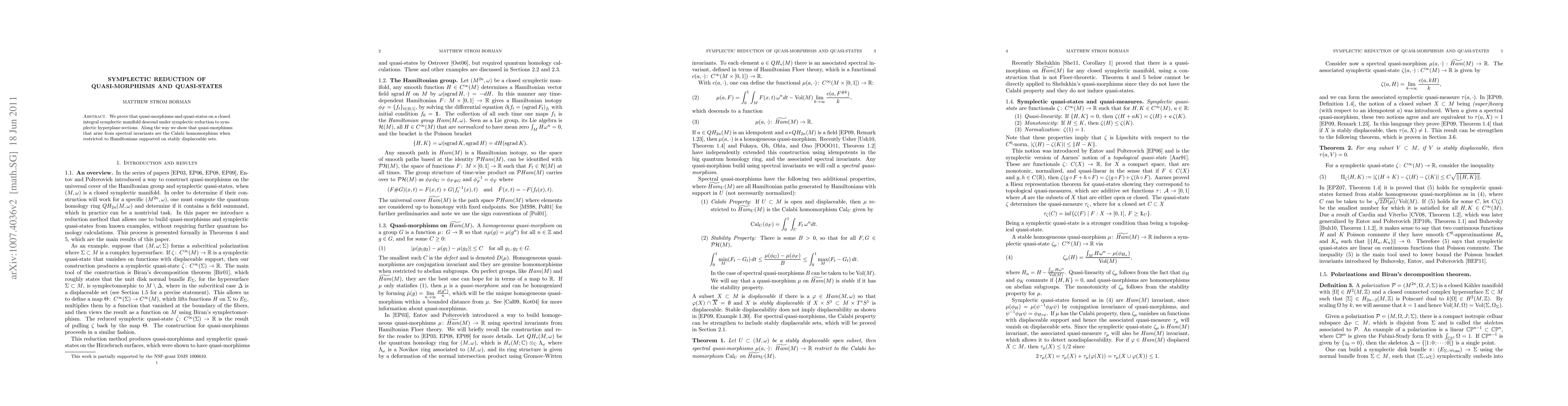 This paper demonstrates that quasi-morphisms and quasi-states on a closed integral symplectic manifold can be reduced to symplectic hyperplane sections via symplectic reduction. It also establishes that quasi-morphisms derived from spectral invariants correspond to the Calabi homomorphism for Hamiltonians on stably displaceable sets.