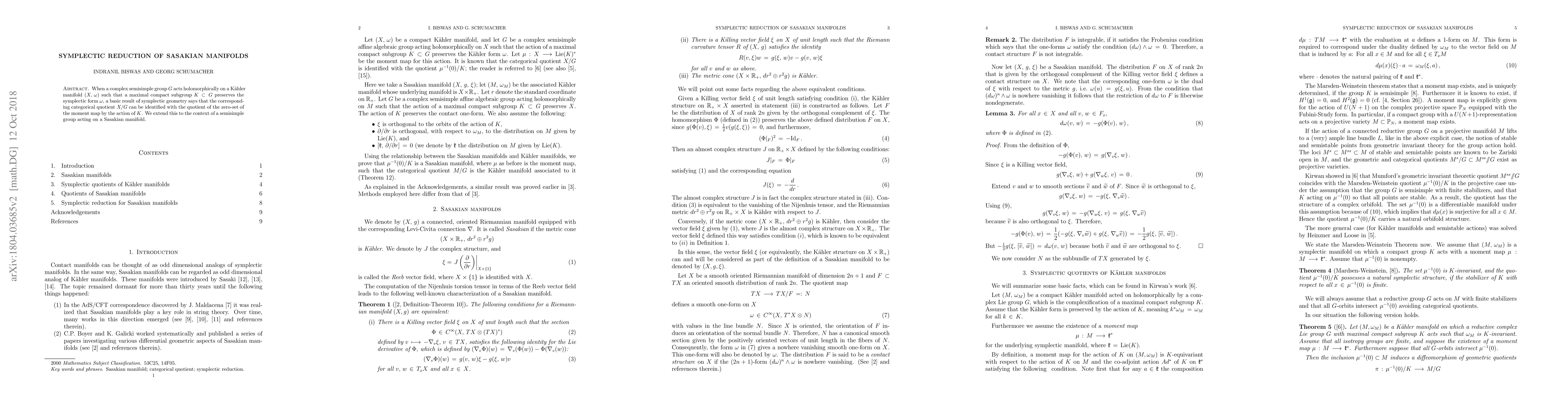 When a complex semisimple group $G$ acts holomorphically on a K\"ahler manifold $(X,\omega)$ such that a maximal compact subgroup $K\subset G$ preserves the symplectic form $\omega$, a basic result of symplectic geometry says that the corresponding categorical quotient $X/G$ can be identified with quotient of the zero-set of the moment map by the action of $K$. We extend this to the context of a semisimple group acting on a Sasakian manifold.