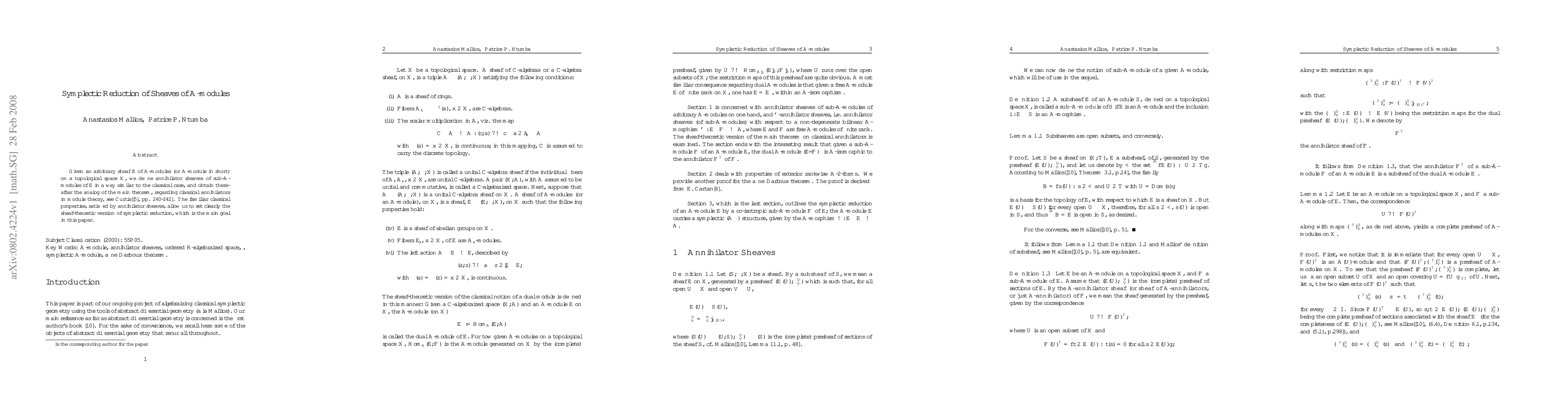 This paper defines annihilator sheaves for $\mathcal{A}$-modules on a topological space $X$ and establishes a symplectic reduction analogous to classical annihilators, achieving a sheaf-theoretic version of symplectic reduction.