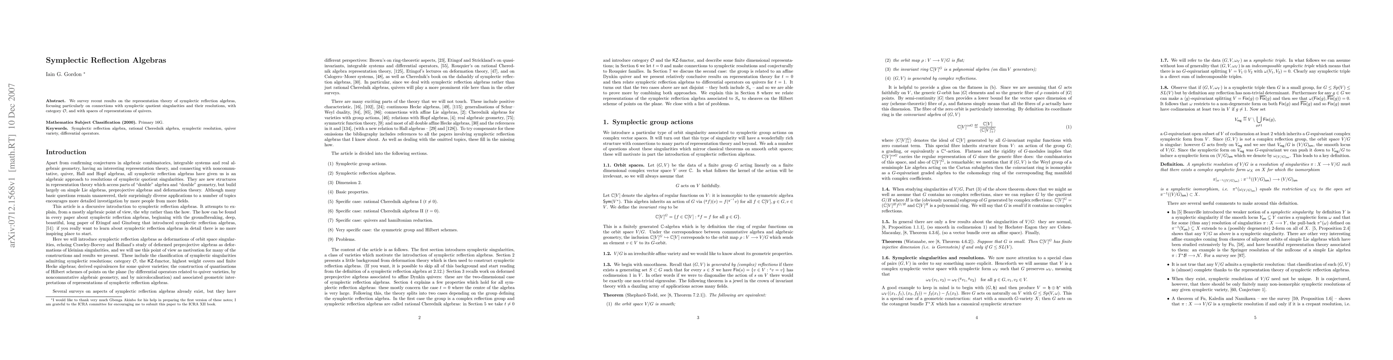 Symplectic reflection algebras are explored for their representation theory, highlighting links to symplectic quotient singularities, quiver representations, and category O. Recent advancements emphasize resolutions and connections to these mathematical structures.