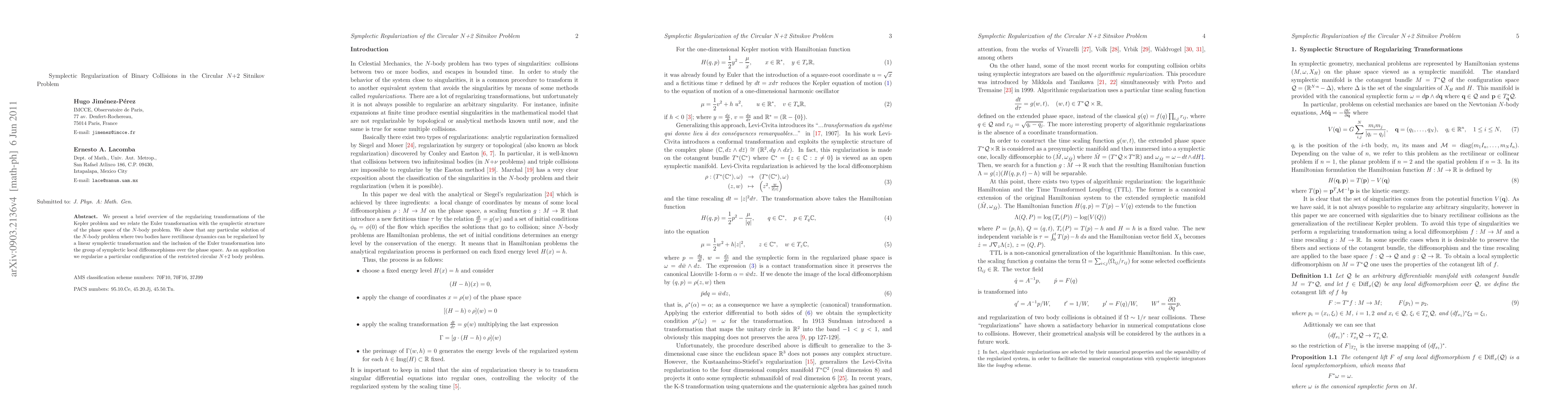 This paper discusses the regularization of binary collisions in the N-body problem using symplectic transformations, specifically applying the Euler transformation to maintain the symplectic structure. It demonstrates how this approach regularizes the dynamics in the circular N+2 Sitnikov problem.