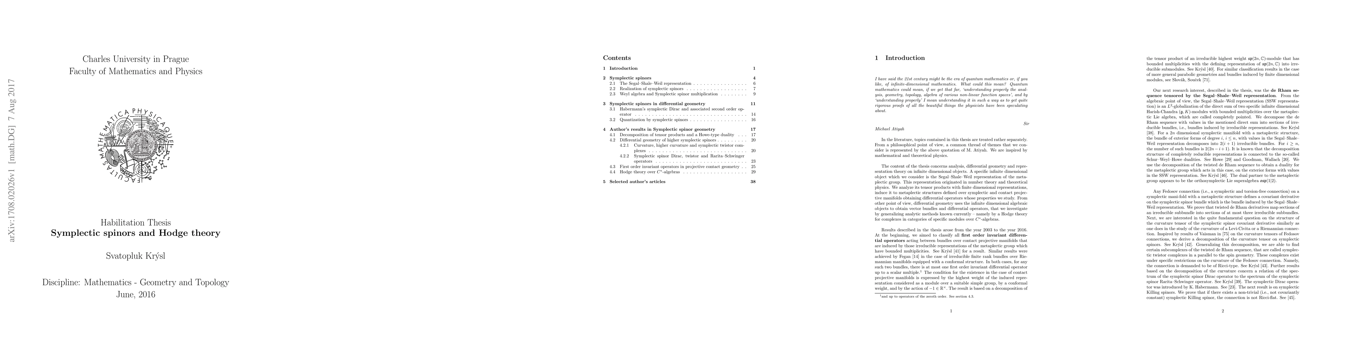 Results on symplectic spinors and their higher spin versions, concerning representation theory and cohomology properties are presented. Exterior forms with values in the symplectic spinors are decomposed into irreducible modules including finding the hidden symmetry (Schur--Weyl--Howe type duality) given by a representation of the Lie superalgebra $\mathfrak{osp}(1|2)$ in this case. We also determine ranges of the induced exterior symplectic spinor derivatives when they are restricted to bundles induced by the irreducible submodules mentioned. This duality is used to decompose curvature tensors of covariant derivatives induced by a Fedosov connection to a symplectic spinor bundle, for characterizing a subcomplex of the de Rham complex twisted by the spinors and for proving that the complex is of elliptic type. Part of the dual is used to characterize Fedosov manifolds admitting symplectic Killing spinors and for relating the spectra of the symplectic Rarita--Schwinger and the symplectic Dirac operator of Habermann. Further, we use the Fomenko--Mishchenko generalization of the Atiyah--Singer index theorem to prove a kind of Hodge theory is valid for elliptic complexes with differentials on projective and finitely generated bundles over the algebra of compact operators and certain further ones.