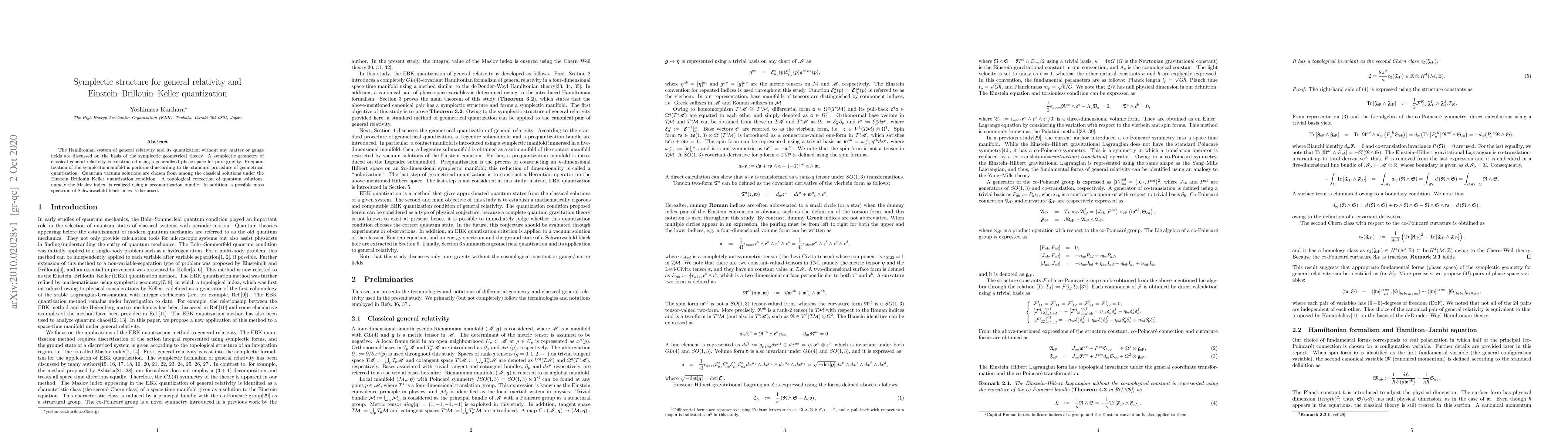 This paper constructs the symplectic geometry for classical general relativity in a generalized phase space and performs geometric quantization to derive quantum vacuum solutions, employing the Einstein-Brillouin-Keller condition. It also discusses a topological correction via the Maslov index and explores the potential mass spectrum of Schwarzschild black holes.
