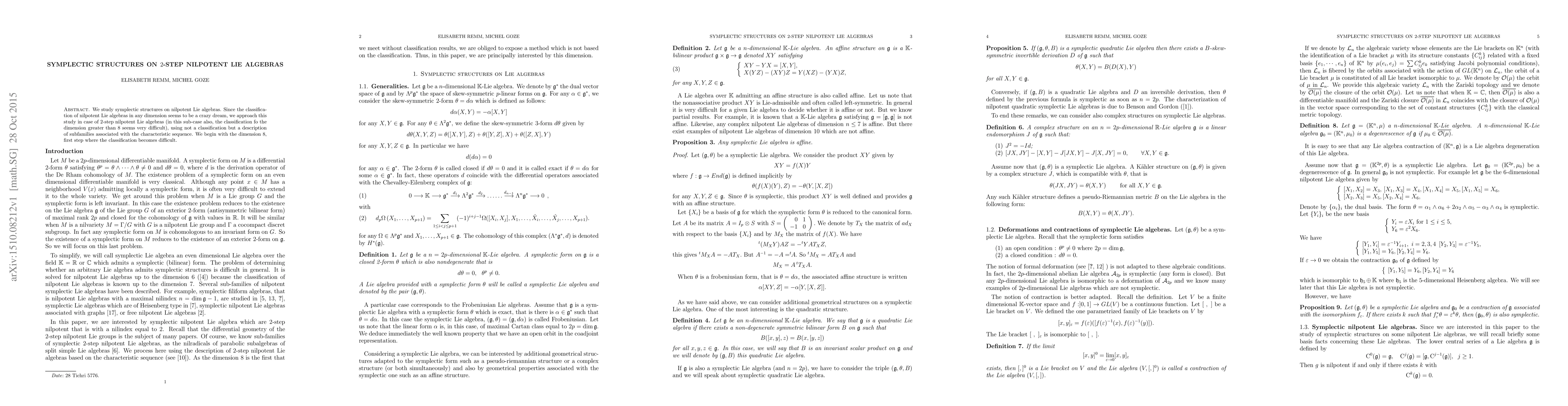 We study symplectic structures on nilpotent Lie algebras. Since the classification of nilpotent Lie algebras in any dimension seems to be a crazy dream, we approach this study in case of 2-step nilpotent Lie algebras (in this sub-case also, the classification fo the dimension greater than 8 seems very difficult), using not a classification but a description of subfamilies associated with the characteristic sequence. We begin with the dimension $8$, first step where the classification becomes difficult.