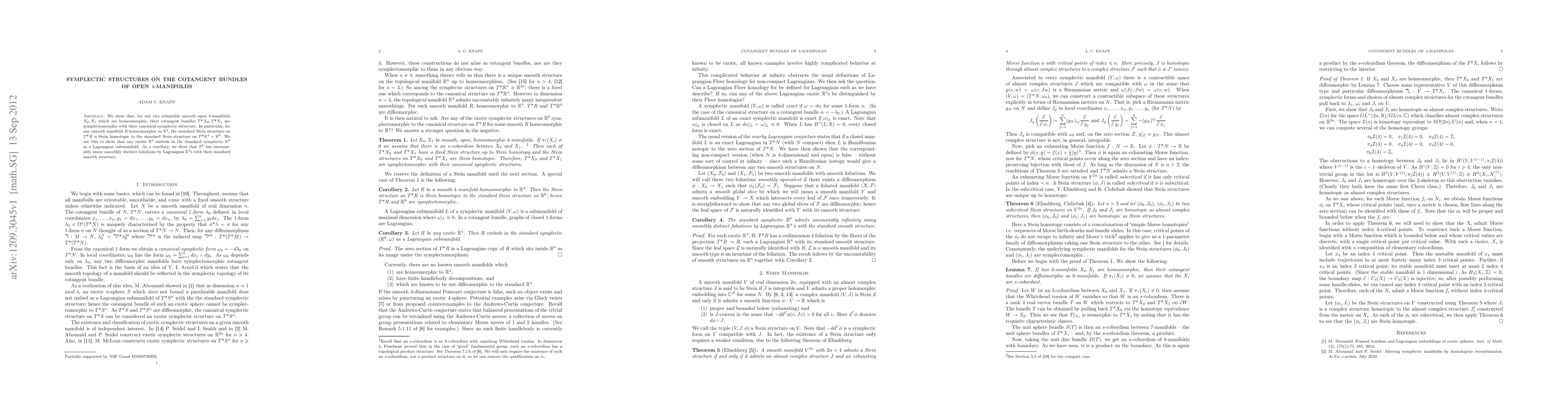 We show that, for any two orientable smooth open 4-manifolds $X_0,X_1$ which are homeomorphic, their cotangent bundles $T^*X_0,T^*X_1$ are symplectomorphic with their canonical symplectic structure. In particular, for any smooth manifold $R$ homeomorphic to $\mathbb{R}^4$, the standard Stein structure on $T^*R$ is Stein homotopic to the standard Stein structure on $T^*\mathbb{R}^4 = \mathbb{R}^8$. We use this to show that any exotic $\mathbb{R}^4$ embeds in the standard symplectic $\mathbb{R}^8$ as a Lagrangian submanifold. As a corollary, we show that $\mathbb{R}^8$ has uncountably many smoothly distinct foliations by Lagrangian $\mathbb{R}^4$s with their standard smooth structure.