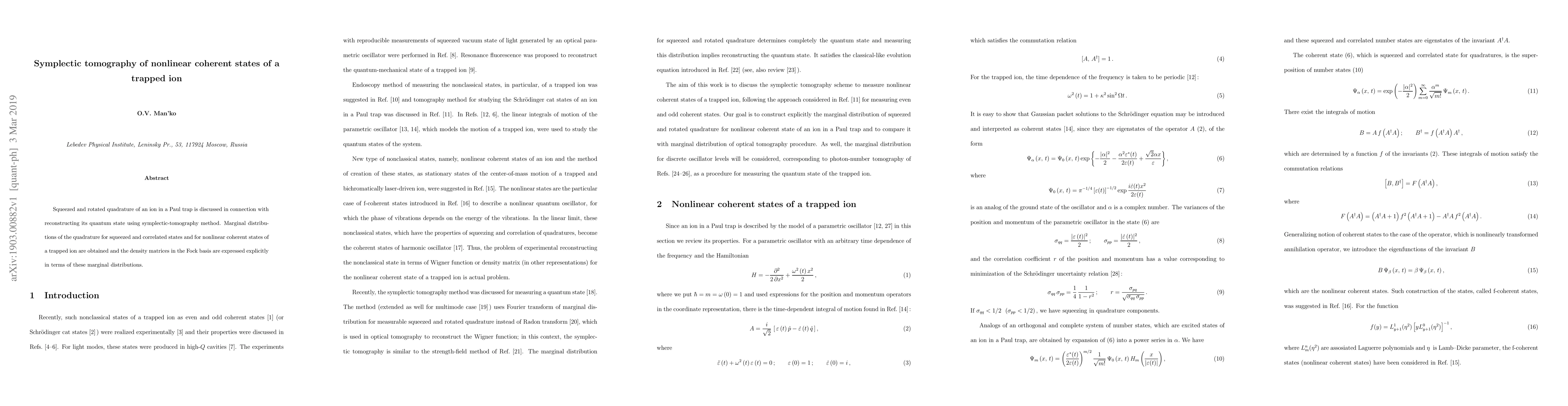 This paper explores the use of symplectic tomography to reconstruct the quantum state of a trapped ion by analyzing its squeezed and rotated quadrature. It derives marginal distributions for squeezed, correlated, and nonlinear coherent states, and explicitly expresses the density matrices in the Fock basis.