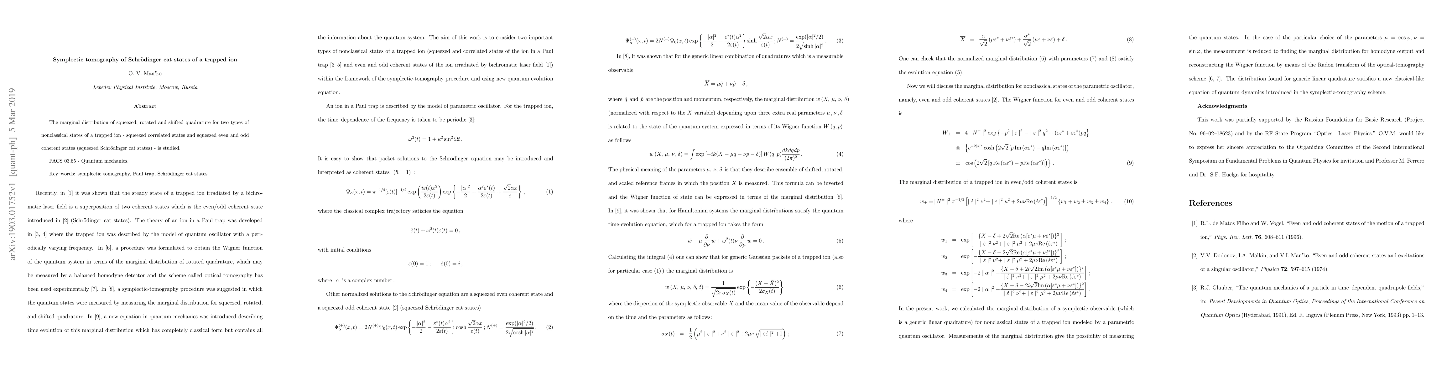 This paper investigates the symplectic tomography of squeezed, rotated, and shifted quadrature distributions for two types of nonclassical states in a trapped ion: squeezed correlated states and squeezed Schrödinger cat states. The study aims to understand the properties of these states through their marginal distributions.