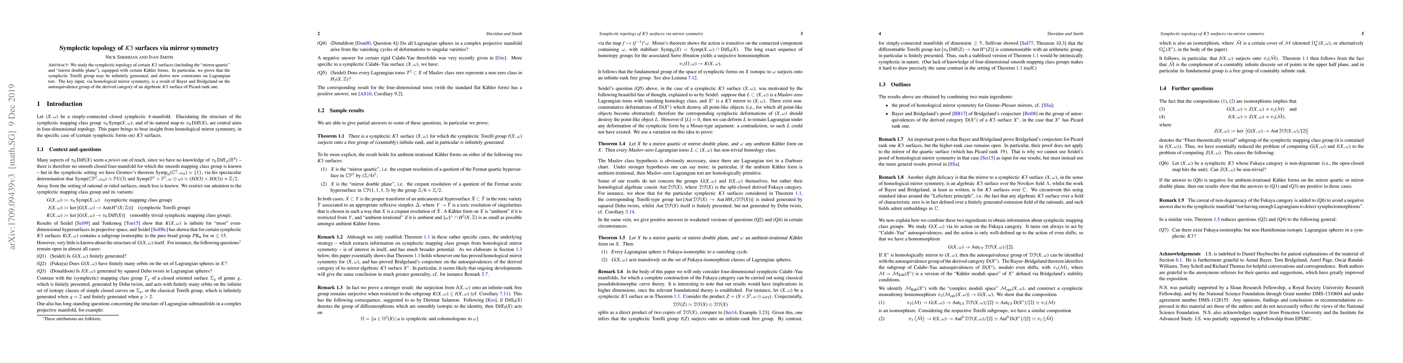 This paper investigates the symplectic topology of specific K3 surfaces using mirror symmetry, demonstrating that the symplectic Torelli group can be infinitely generated and establishing new constraints on Lagrangian tori, leveraging results from homological mirror symmetry and the autoequivalence group of the derived category of algebraic K3 surfaces.