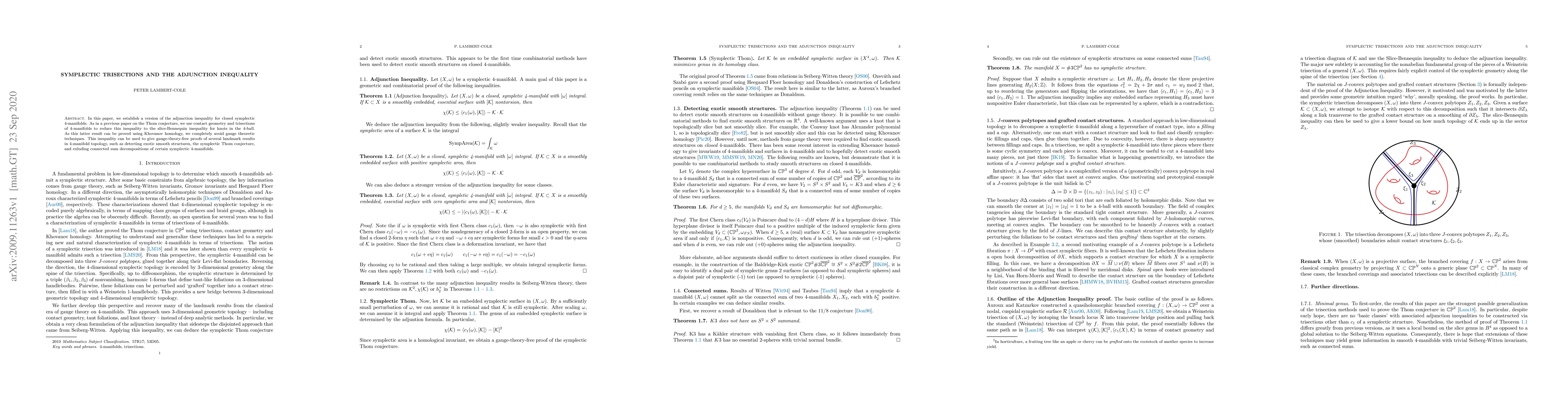 This paper establishes an adjunction inequality for closed symplectic 4-manifolds using symplectic trisections and contact geometry, reducing it to the slice-Bennequin inequality for knots via Khovanov homology, thereby providing gauge-theory-free proofs for several significant results in 4-manifold topology.