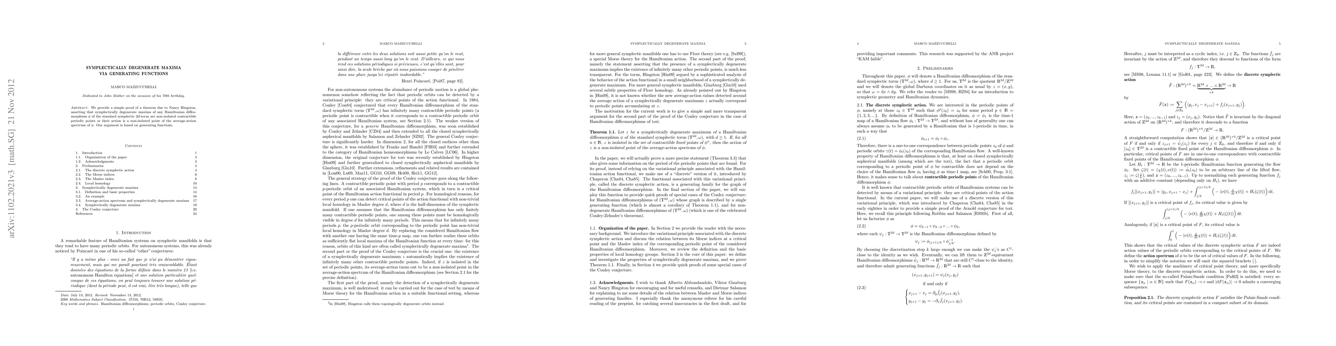 We provide a simple proof of a theorem due to Nancy Hingston, asserting that symplectically degenerate maxima of any Hamiltonian diffeomorphism of the standard symplectic 2d-torus are non-isolated contractible periodic points or their action is a non-isolated point of the average-action spectrum. Our argument is based on generating functions.