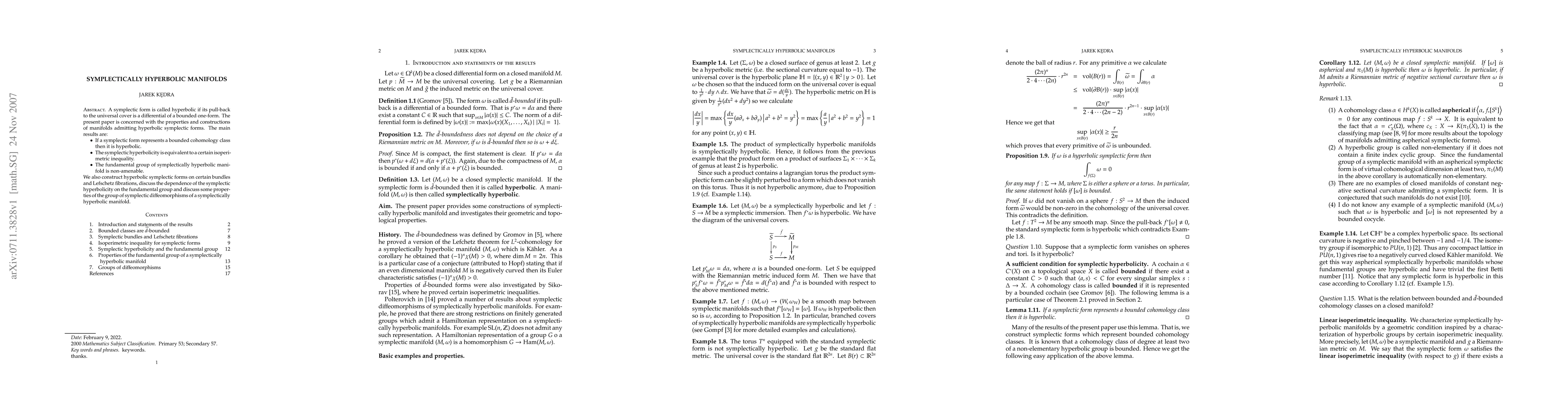 A symplectic form is called hyperbolic if its pull-back to the universal cover is a differential of a bounded one-form. The present paper is concerned with the properties and constructions of manifolds admitting hyperbolic symplectic forms. The main results are: * If a symplectic form represents a bounded cohomology class then it is hyperbolic. * The symplectic hyperbolicity is equivalent to a certain isoperimetric inequality. * The fundamental group of symplectically hyperbolic manifold is non-amenable. We also construct hyperbolic symplectic forms on certain bundles and Lefschetz fibrations, discuss the dependenc of the symplectic hyperbolicity on the fundamental group and discuss some properties of the group of symplectic diffeomorphisms of a symplectically hyperbolic manifold.