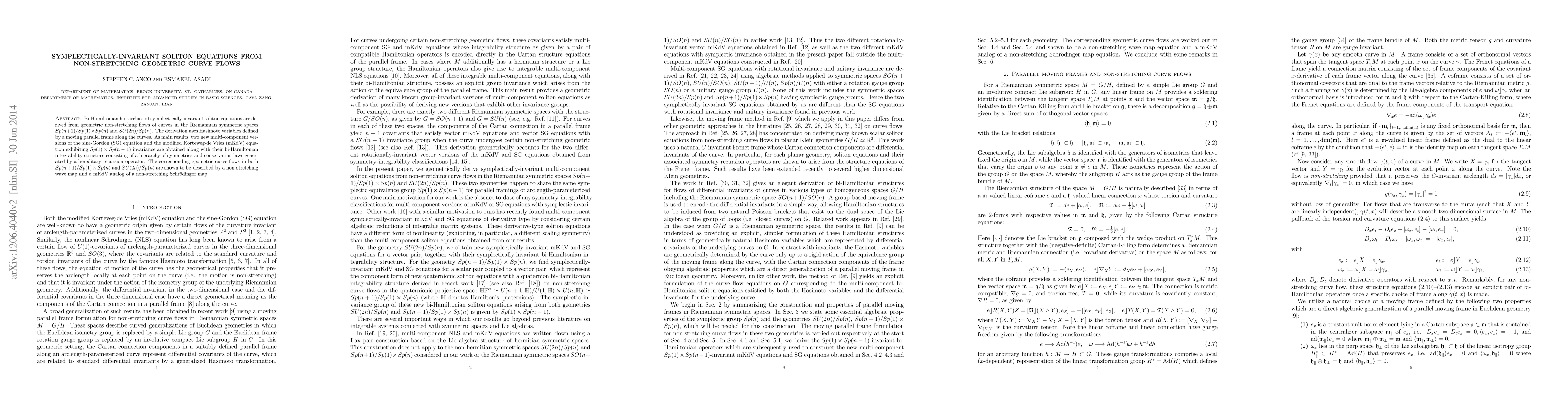 A moving frame formulation of geometric non-stretching flows of curves in the Riemannian symmetric spaces $Sp(n+1)/Sp(1)\times Sp(n)$ and $SU(2n)/Sp(n)$ is used to derive two bi-Hamiltonian hierarchies of symplectically-invariant soliton equations. As main results, multi-component versions of the sine-Gordon (SG) equation and the modified Korteweg-de Vries (mKdV) equation exhibiting $Sp(1)\times Sp(n-1)$ invariance are obtained along with their bi-Hamiltonian integrability structure consisting of a shared hierarchy of symmetries and conservation laws generated by a hereditary recursion operator. The corresponding geometric curve flows in $Sp(n+1)/Sp(1)\times Sp(n)$ and $SU(2n)/Sp(n)$ are shown to be described by a non-stretching wave map and a mKdV analog of a non-stretching Schr\"odinger map.