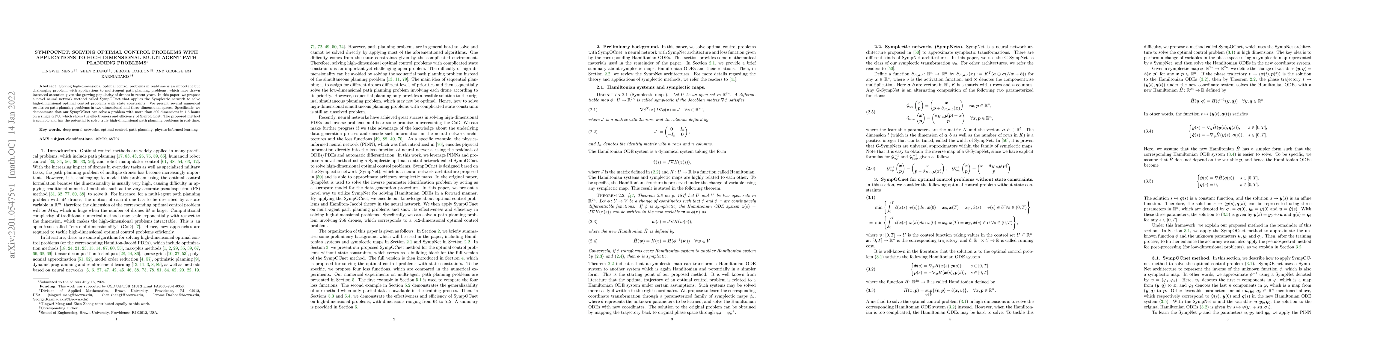 SympOCnet, a novel neural network method utilizing the Symplectic network, efficiently solves high-dimensional optimal control problems with state constraints, demonstrating effectiveness in real-time multi-agent path planning, particularly for drones. The method successfully tackled a 500-dimensional problem in 1.5 hours on a single GPU, showcasing its scalability and potential for real-time applications.