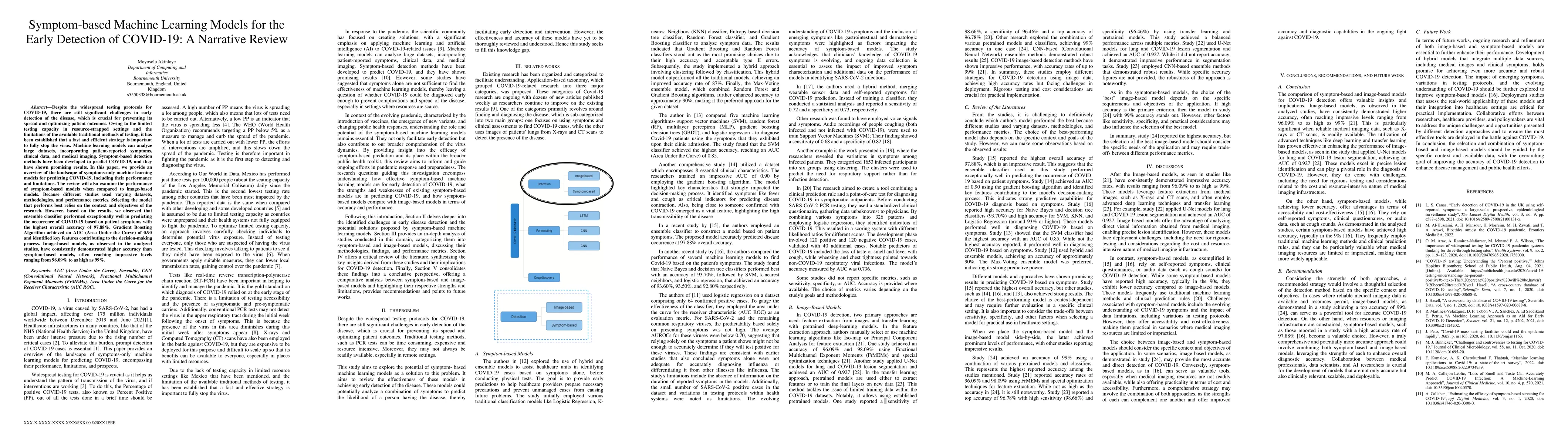 This paper reviews symptom-based machine learning models for early COVID-19 detection, highlighting their performance and limitations compared to image-based models. Ensemble classifiers showed the best results, achieving 97.88% accuracy, while image-based models consistently outperformed them, reaching accuracies from 96.09% to 99%.