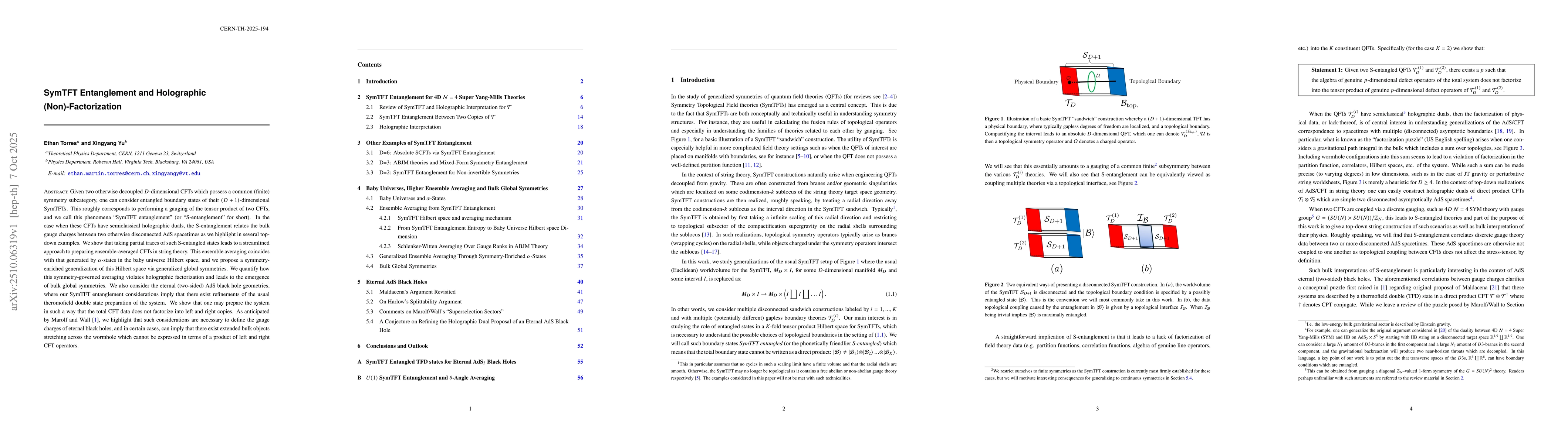Given two otherwise decoupled $D$-dimensional CFTs which possess a common (finite) symmetry subcategory, one can consider entangled boundary states of their $(D+1)$-dimensional SymTFTs. This roughly corresponds to performing a gauging of the tensor product of two CFTs, and we call this phenomena ``SymTFT entanglement" (or ``S-entanglement" for short). In the case when these CFTs have semiclassical holographic duals, the S-entanglement relates the bulk gauge charges between two otherwise disconnected AdS spacetimes as we highlight in several top-down examples. We show that taking partial traces of such S-entangled states leads to a streamlined approach to preparing ensemble-averaged CFTs in string theory. This ensemble averaging coincides with that generated by $\alpha$-states in the baby universe Hilbert space, and we propose a symmetry-enriched generalization of this Hilbert space via generalized global symmetries. We quantify how this symmetry-governed averaging violates holographic factorization and leads to the emergence of bulk global symmetries. We also consider the eternal (two-sided) AdS black hole geometries, where our SymTFT entanglement considerations imply that there exist refinements of the usual theromofield double state preparation of the system. We show that one may prepare the system in such a way that the total CFT data does not factorize into left and right copies. As anticipated by Marolf and Wall \cite{Marolf:2012xe}, we highlight that such considerations are necessary to define the gauge charges of eternal black holes, and in certain cases, can imply that there exist extended bulk objects stretching across the wormhole which cannot be expressed in terms of a product of left and right CFT operators.