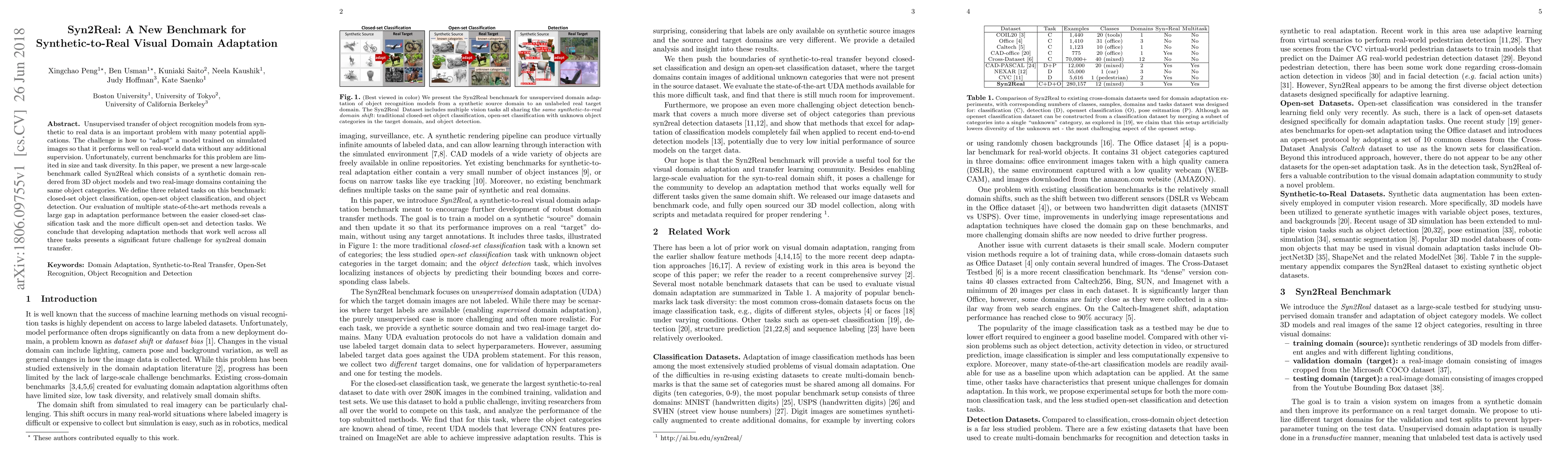 The Syn2Real benchmark introduces a new large-scale dataset for evaluating synthetic-to-real visual domain adaptation, featuring tasks like closed-set and open-set classification, and object detection. The study highlights a significant performance gap across these tasks, indicating a major challenge for future domain adaptation research.